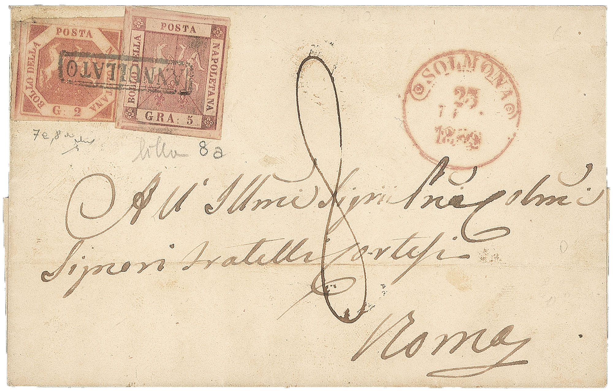 Antichi Stati Italiani - Napoli - Lettera (7e + 8a)Lettera affrancata con 2 grana carminio vivo III tavola + 5 grana rosa lillaceo (7e + 8a) da Sulmona 25 LUG.1859 per Roma con tassa 8 bajocchi per l'inoltro a destino