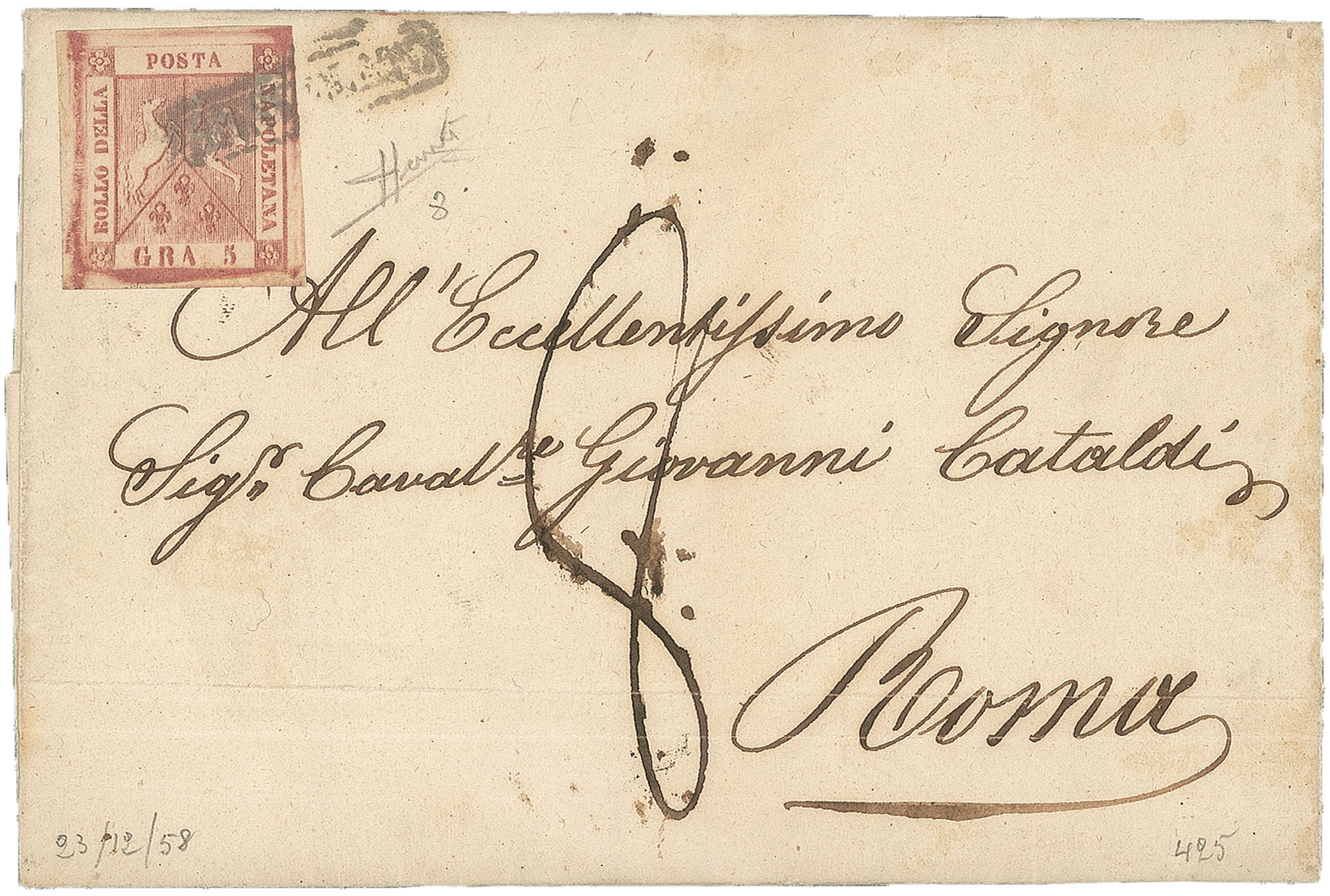 Antichi Stati Italiani - Napoli - Lettera (8 cat. 450)Lettera da Napoli 23 dicembre per Roma con 5 gr. rosa brunastro 1a Tavola (8 cat. 450) molto ben marginato e fresco - tassa pontificia per inoltro a destino - firma Sorani
