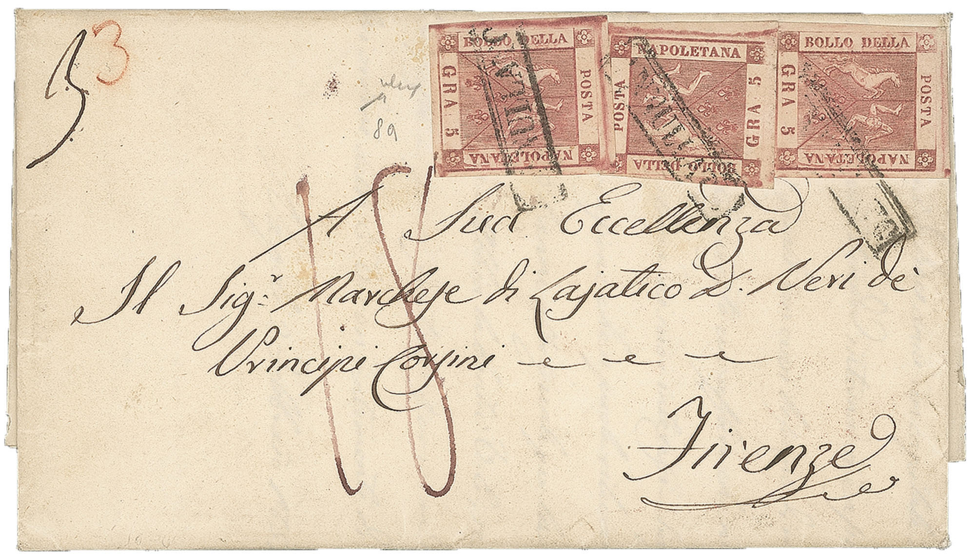 Antichi Stati Italiani - Napoli - Lettera (8a cat.8750)Lettera affrancata con tre esemplari del 5 grana rosa brunastro (8a cat.8750) con il bollo in cartella annullato da Napoli 2 FEB 1857 per Firenze - tassa 18 per l'inoltro a destino