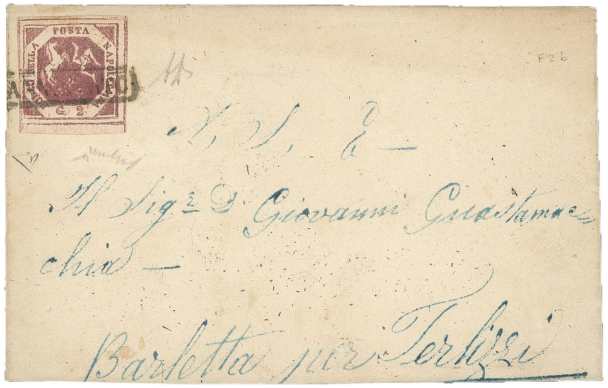 Antichi Stati Italiani - Napoli - Lettera con falso per posta 2 grana (F2b cat.5500)Lettera affrancata con falso per posta 2 grana violetto II tipo ben marginato (F2b cat.5500) da Napoli 10 NOV.1860 per Terlizzi - firma AD + cert. Enzo Diena