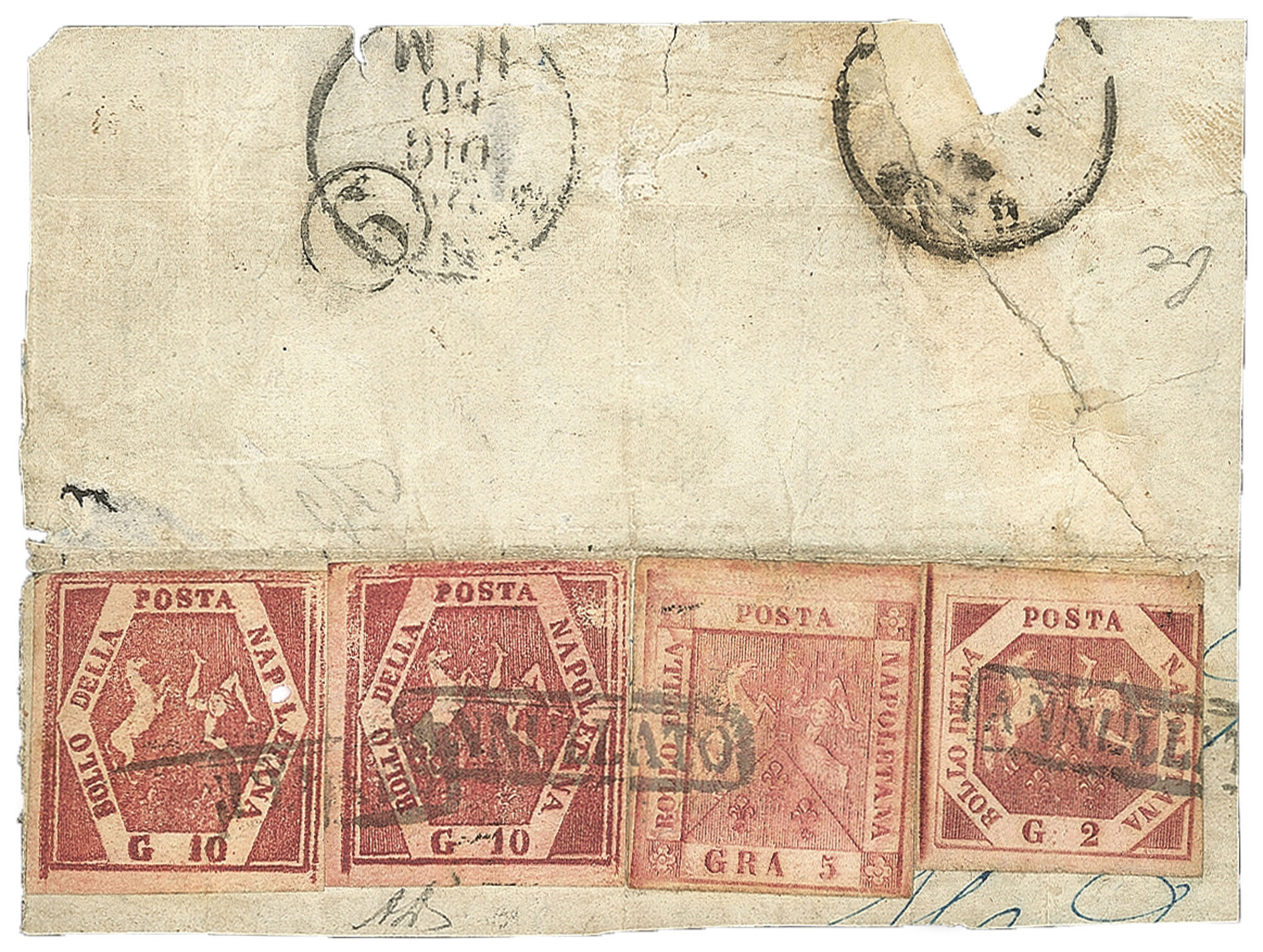 Antichi Stati Italiani - Napoli - Frammento di lettera (F7 cat.11000+)Ampio frammento di lettera con due esemplari Falsi per posta del 10 grana V tipo + 5 grana II tavola + 2 grana III tavola (F7 cat.11000+) - cert. Alberto Diena