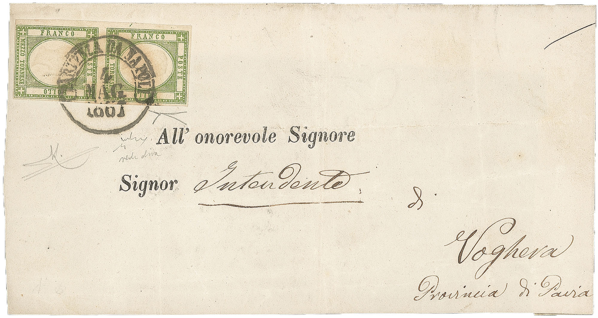 Antichi Stati Italiani - Napoli - Province Napoletane - Lettera (17b cat.7000)Lettera affrancata con coppia verticale del 1/2 tornese verde oliva (17b cat.7000) annullata con bollo Partenza da Napoli 4 MAG.1861 per Voghera - un esemplare interessato da leggera piega - interessante tariffa di primo porto per stampati diretto al di fuori delle province - ottimo aspetto - cert. Bottacchi