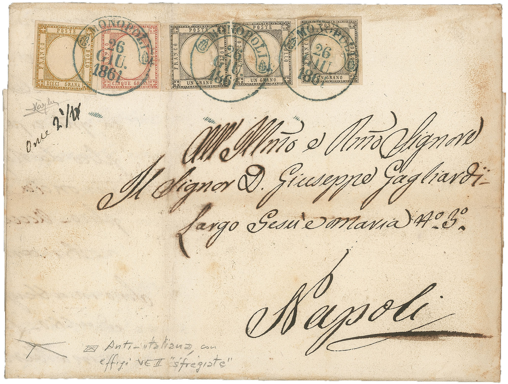 Antichi Stati Italiani - Napoli - Province Napoletane - Lettera (19a + 21e + 22a)Lettera con affrancatura tricolore con 1 grano grigio scuro tre esemplari + 5 grana rosa + 10 grana giallo ocra (19a + 21e + 22a) da Monopoli 26 GIU.1861 per Napoli - Dal certificato Bottacchi: 'ai francobolli, in sfregio alla figura del monarca sabaudo (poco tollerato dai cittadini filo-borbonici), fu all'epoca grattata mediante apposita abrasione la barba delle effigi a rilievo che risultano così vilipese co chiaro intento anti-Sabaudo'
