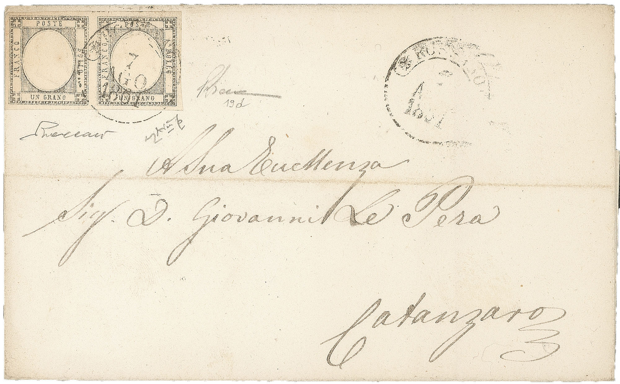 Antichi Stati Italiani - Napoli - Province Napoletane - Lettera (19d)Lettera affrancata con coppia orizzontale del 1 grano grigio argento (19d) perfetta e ben marginata da Rossano 7 AGO.1861 a Catanzaro - gradazione di colore molto rara di splendida qualità - cert. P.Vaccari