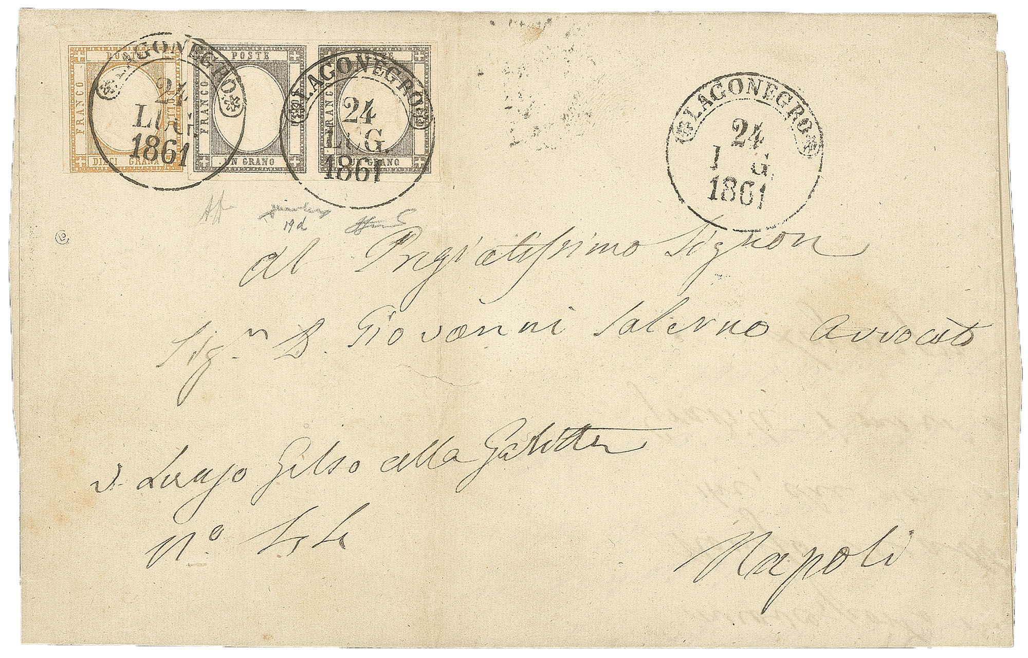 Antichi Stati Italiani - Napoli - Province Napoletane - Lettera 1 grano + 10 granaLettera affrancata con coppia orizzontale del 1 grano grigio nero con filetto di inquadratura in alto + 10 grana bistro da Lagonegro 24 LUG.1861 per Napoli - varietà molto rara e probabilmente unica nota in coppia - firme AD + Chiavarello