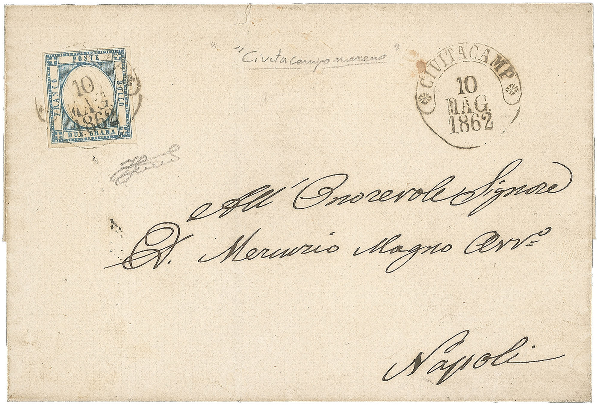 Antichi Stati Italiani - Napoli - Province Napoletane - (p.ti 8) su 2 grana (20)Civitacampomarano cerchio (p.ti 8) su 2 grana (20) - perfetto - su sovracoperta di lettera del 10 MAG.1862 per Napoli
