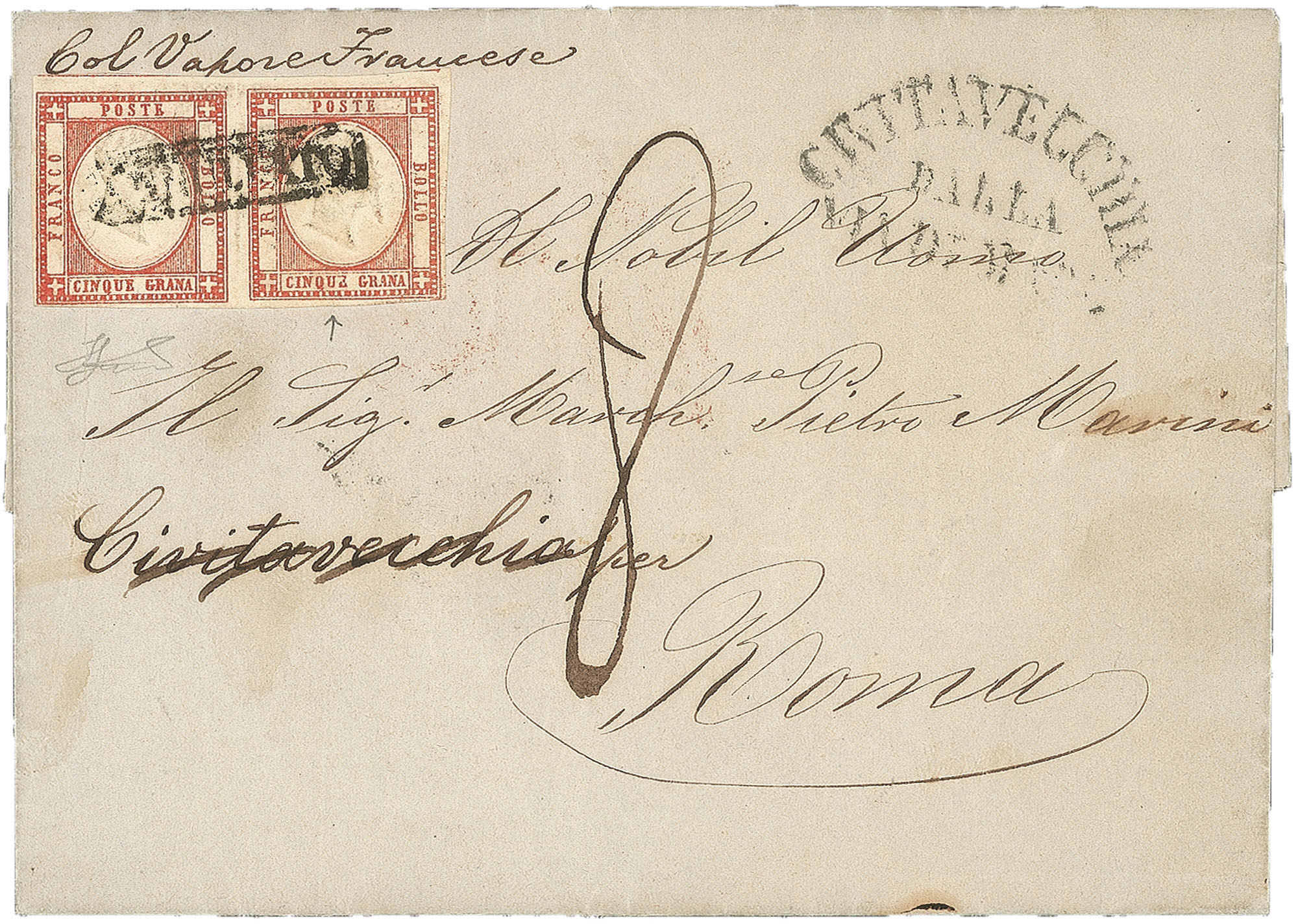 Antichi Stati Italiani - Napoli - Province Napoletane - (p.ti 12) - coppia orizzontale del 5 grana (21)Ufficio Postale Porto di Napoli ovale in rosso (p.ti 12) - coppia orizzontale del 5 grana (21) - perfetta - su lettera del 5.3.1861 per Roma - tassata 8 bajocchi - rara