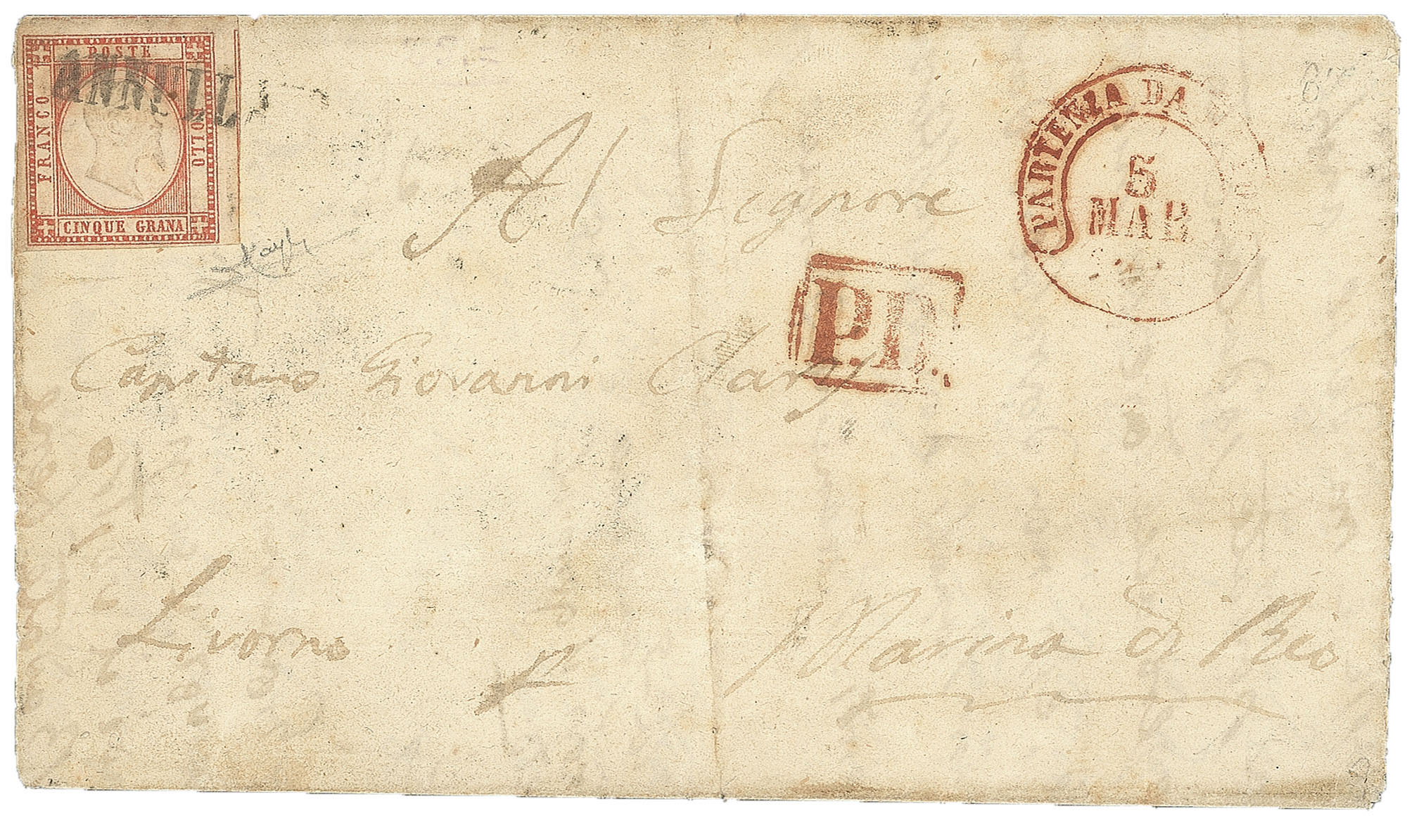 Antichi Stati Italiani - Napoli - Province Napoletane - Bollo ANNULLATO (21 P.ti12 cat.5500)Bollo ANNULLATO senza cartiglio su 5 grana rosso carminio su lettera per Marina di Rio (Isola d'Elba) con bollo Partenza da Napoli 5 MAR.1861 + P.D. in cartella rossi (21 P.ti12 cat.5500) - firma Raybaudi