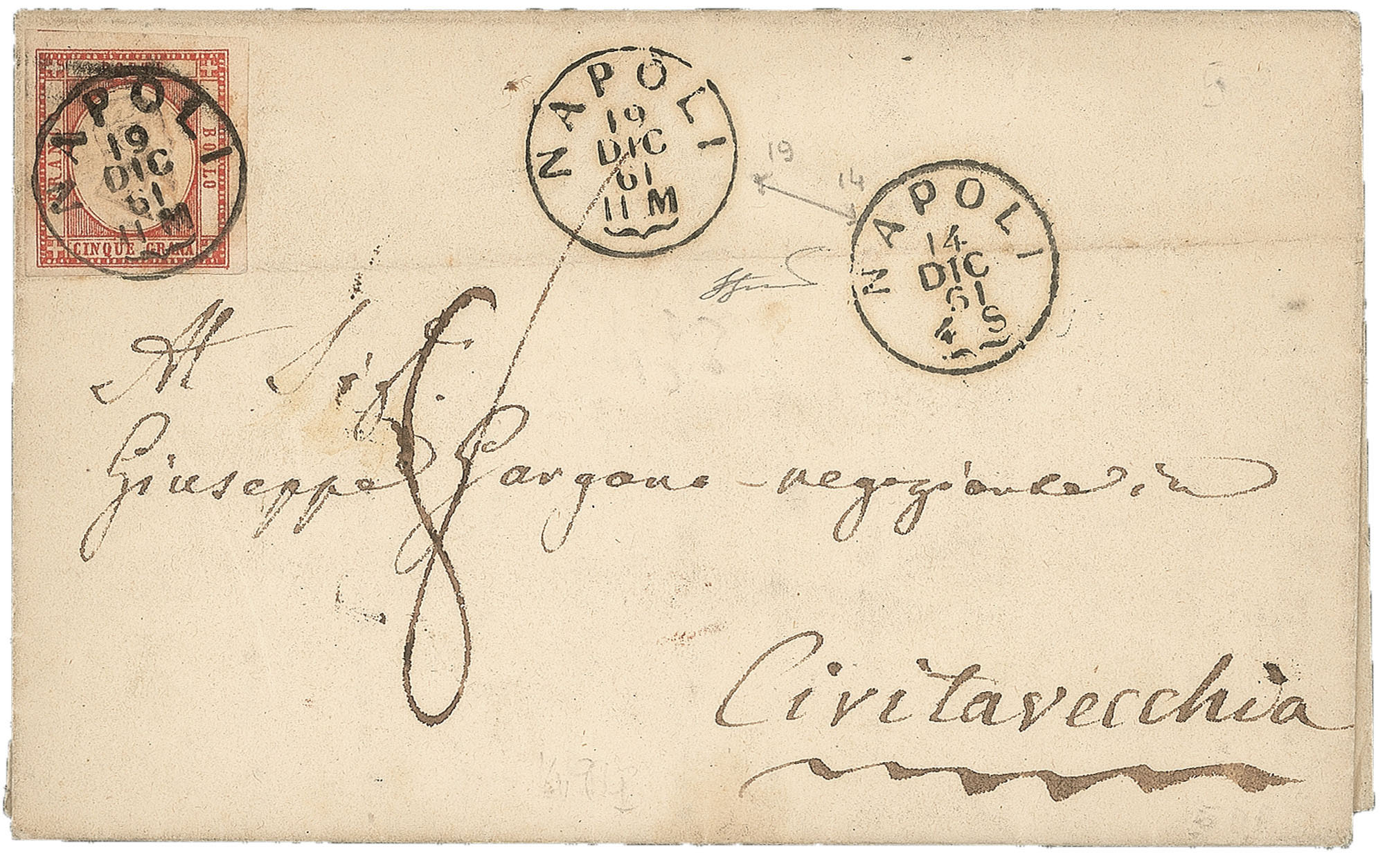 Antichi Stati Italiani - Napoli - Province Napoletane - 1861 - 5 grana (21)5 grana rosso carminio (21) - perfetto - su lettera da Napoli 19 DIC 61 a Civitavecchia - tassata 8 bajocchi - Sul fronte compare anche il datario di Napoli del 14 DIC 61 la lettera venne probabilmente imbucata non affrancata in quella data ma non le venne dato corso in attesa della regolarizzazione da parte del mittente della tariffa richiesta - molto interessante