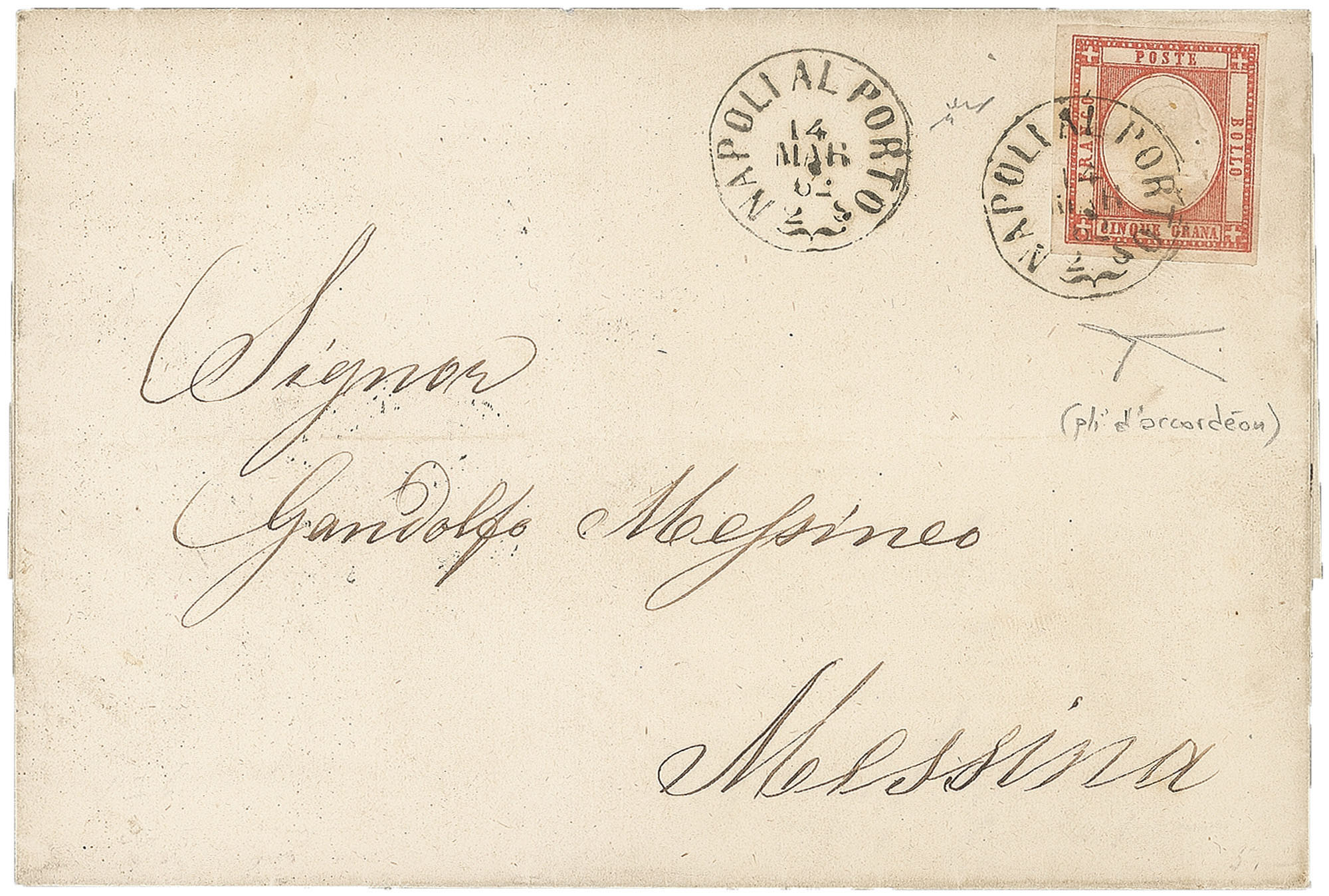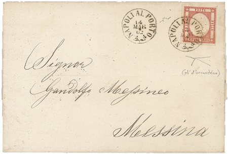Antichi Stati Italiani - Napoli - Province Napoletane - Sopracoperta di lettera (21)Sopracoperta di lettera affrancata con 5 grana rosso carminio (21) bel pli d'accordèon orizzontale da Napoli 14 MAR 62 a Messina - Rara varietà su questa emissione di splendida qualità - Firma Chiavarello + cert. Bottacchi