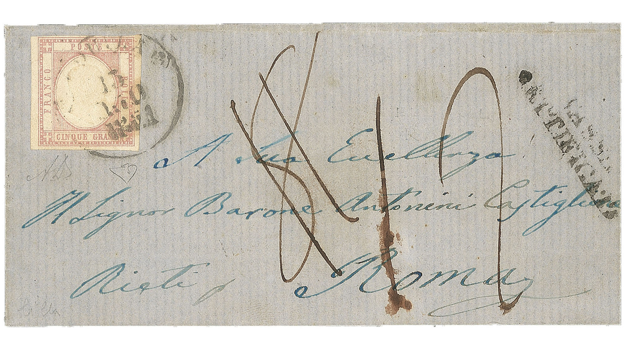 Antichi Stati Italiani - Napoli - Province Napoletane - 5 grana (21c - perfetto) su sovracoperta di lettera5 grana lilla (21c - perfetto) su sovracoperta di lettera da L'Aquila 13.8.1861 per Roma - tassata per 8 bajocchi poi cassati e corretti in 12 con l'apposizione del lineare 'tassa rettificata' di Roma in nero - interessante - Firma A. + E. Diena
