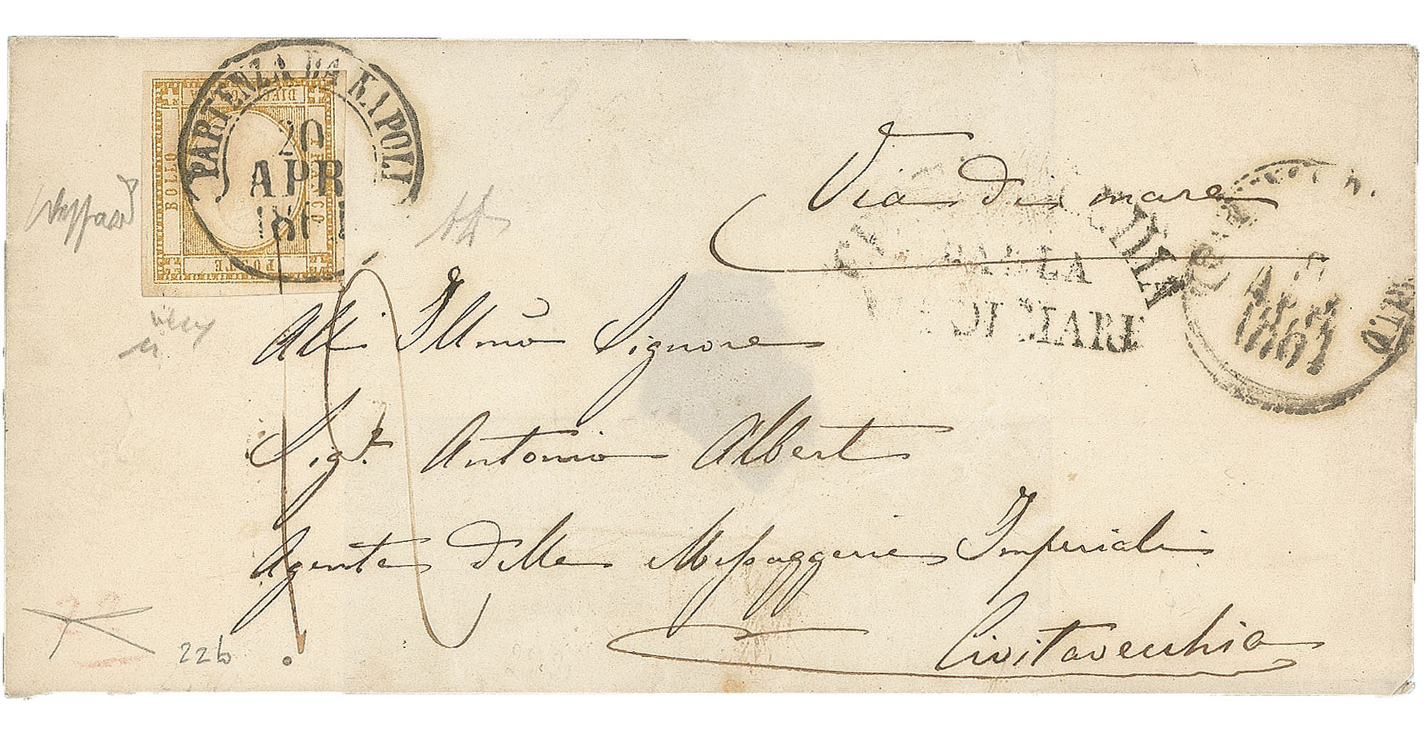 Antichi Stati Italiani - Napoli - Province Napoletane - Lettera (22b cat.4750)Lettera per Civitavecchia viaggiata per via di mare affrancata con 10 grana bistro oliva (22b cat.4750) annullato Partenza da Napoli 20 APR.1861 - firme Caffaz + AD + Chiavarello