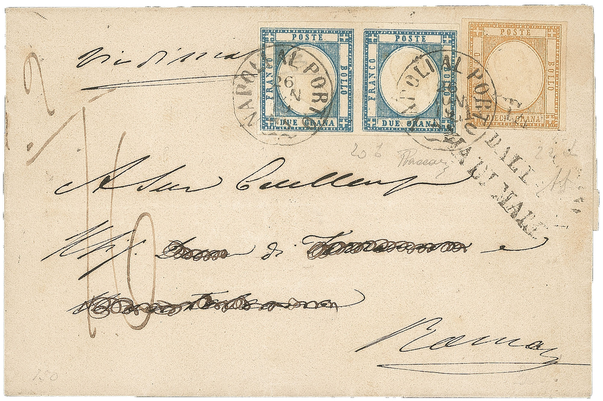 Antichi Stati Italiani - Napoli - Province Napoletane - 10 grana (22d) + coppia 2 grana (20b)10 grana bistro arancio (22d - perfetto) + coppia del 2 grana azzurro (20b - piega verticale a sinistra) su sovracoperta di lettera da Napoli 26.11.1861 a Roma - bollo via di mare di Civitavecchia coannullatore - tassata 16 bajocchi - molto fresca e di ottimo aspetto - Firma A.Diena