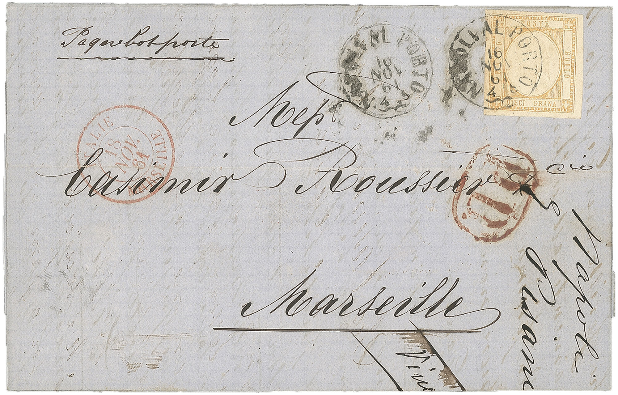 Antichi Stati Italiani - Napoli - Province Napoletane - Lettera (22c cat.1950)Lettera via di mare da Napoli al Porto 16 NOV 61 per Marsiglia affrancata con 10 grana bistro (22c cat.1950) esemplare con ampi margini e con colore chiarissimo