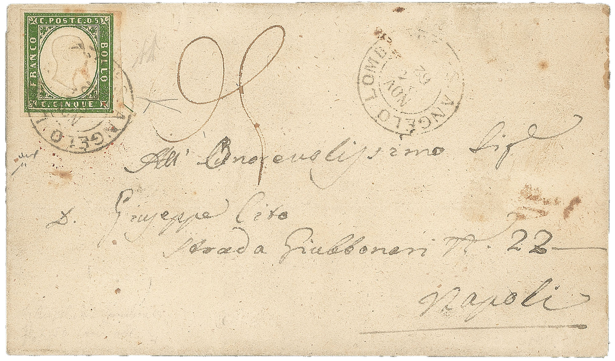 Antichi Stati Italiani - Napoli - Province Napoletane - S.Angelo di Lombardi su 5 cent (13D perfetto)S.Angelo di Lombardi (mese e giorno invertiti) su 5 cent IV emissione di Sardegna (13D perfetto) su sovracoperta di lettera del 24.11.1862 per Napoli tassata 5 cent - interessante non comune - firme A.Diena + Bottacchi + Chiavarello