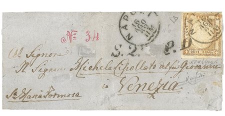 Antichi Stati Italiani - Napoli - Province Napoletane - 1861 - 10 grana (F8)10 grana arancio falso per posta del II tipo effige C (F8) - perfetto - su lettera da Napoli 16 AGO 62 a Venezia - destinazione estremamente rara - ex collezione Rothschild