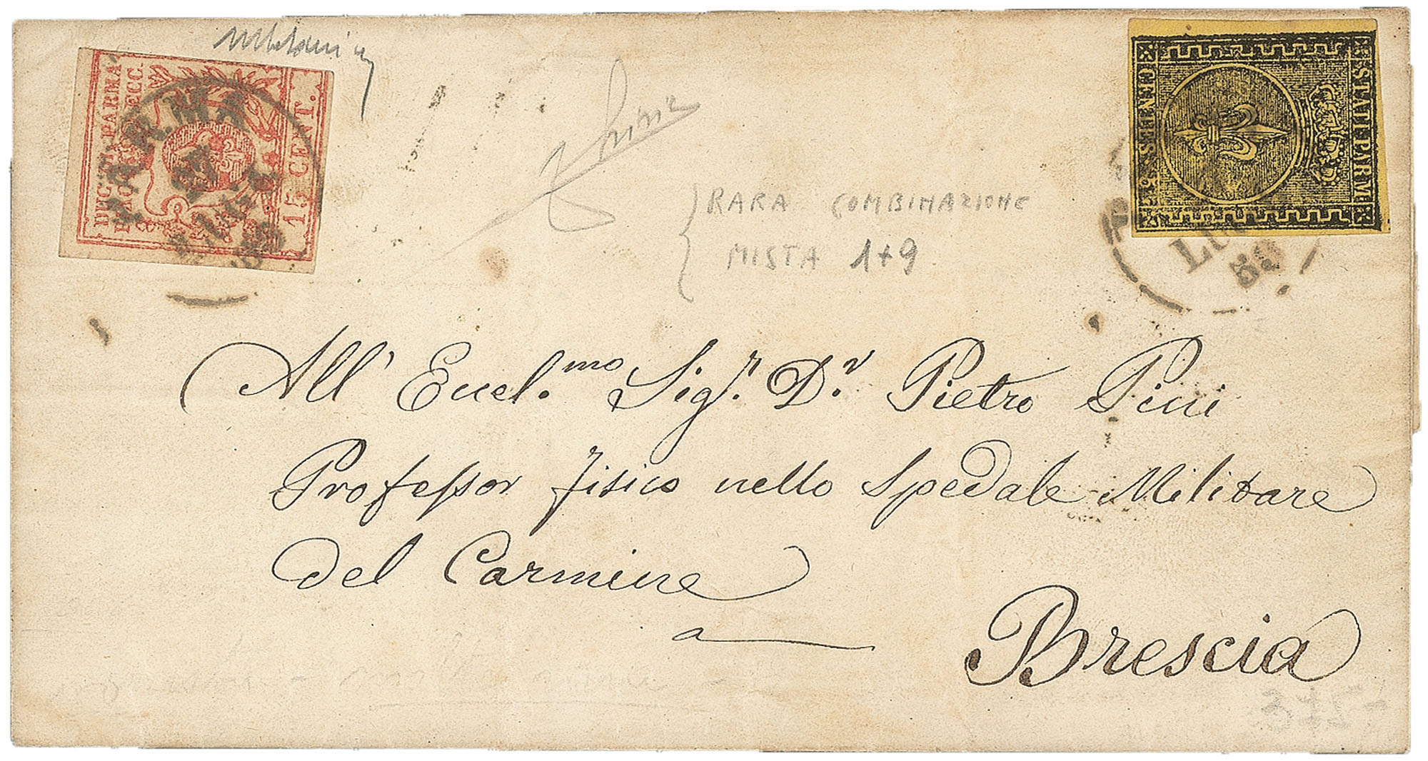 Antichi Stati Italiani - Parma - Lettera con affrancatura mista (1 + 9)Lettera con affrancatura mista in periodo di Governo Provvisorio composta da 5 cent giallo + 15 cent vermiglio (1 + 9) da Parma 27 LUGL 59 per Brescia - alcuni difetti ma molto fresca - cert. M.Catania