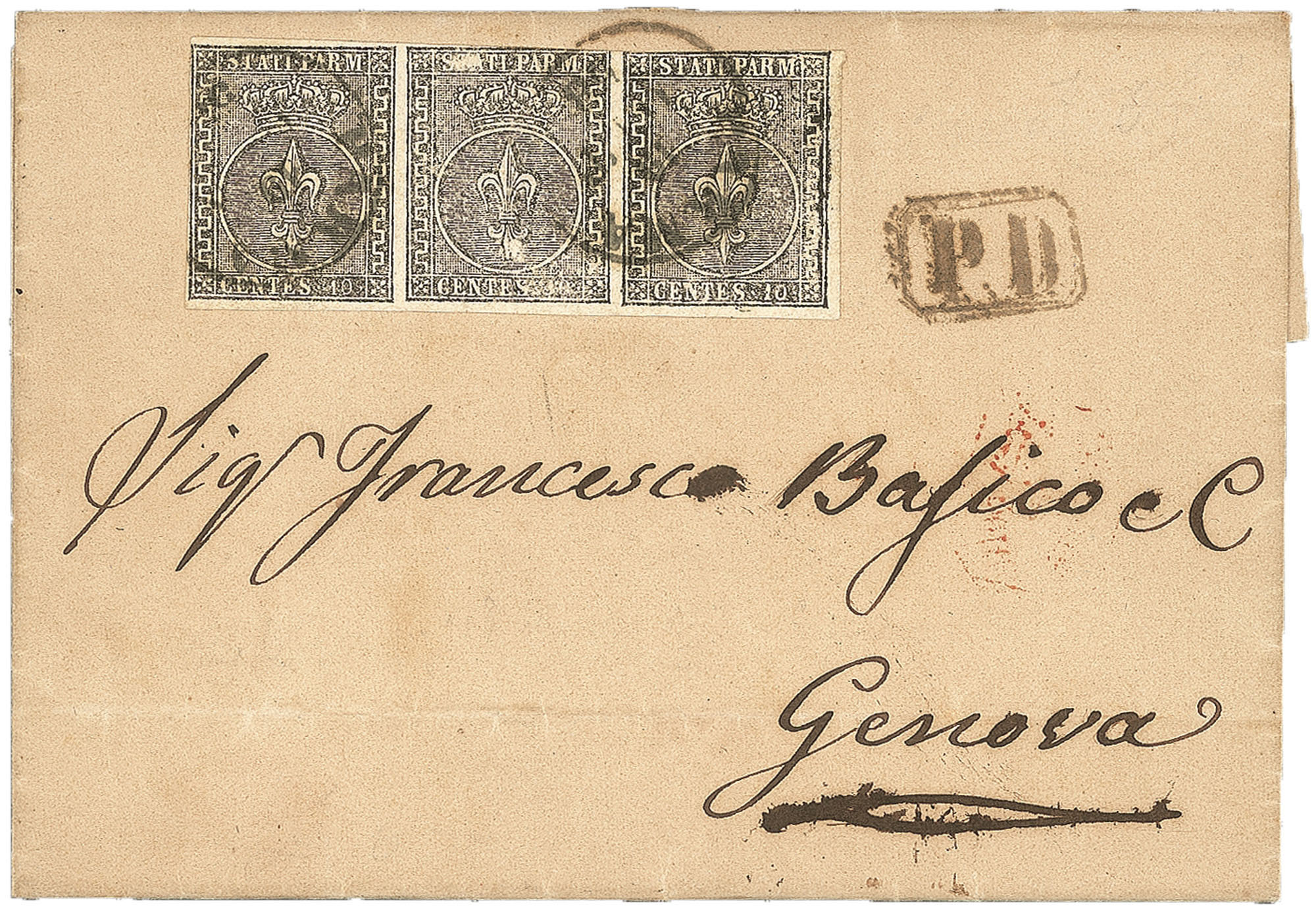 Antichi Stati Italiani - Parma - 10 cent (2 cat. 6.000)Striscia di tre esemplari 10 cent bianco su lettera da PARMA 19 OTT. 58 a Genova con bollo PD (2 cat. 6.000) - molto fresca