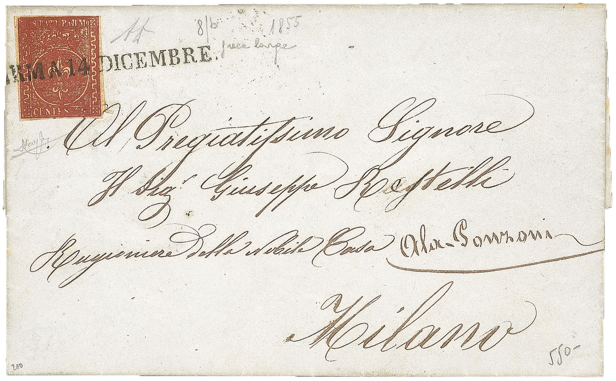 Antichi Stati Italiani - Parma - Lettera (8)Lettera affrancata con 25 cent bruno rosso (8) da Parma 14 Dicembre del 1855 per Milano - cert. Raybaudi