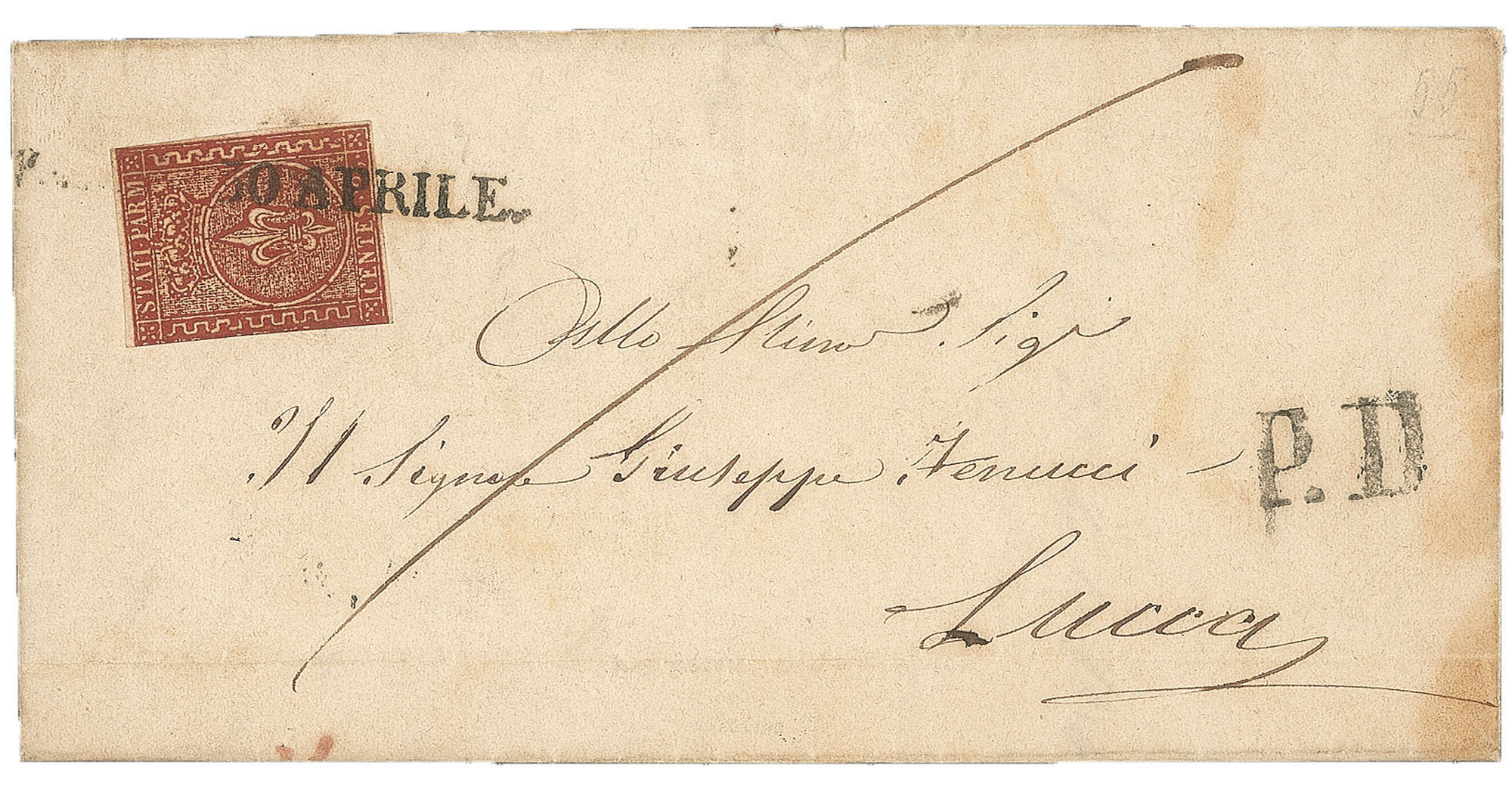 Antichi Stati Italiani - Parma - Lettera (8 cat. 3250)Lettera da Parma 30 APRILE del 1856 diretta a Lucca in Toscana con bollo PD affrancata con 25 cent bruno rosso (8 cat. 3250)