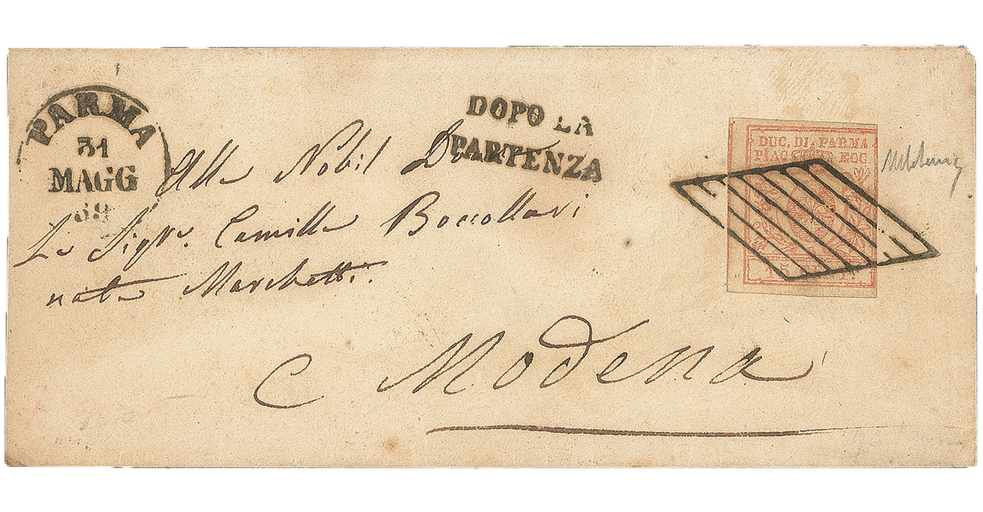 Antichi Stati Italiani - Parma - Lettera (9a) con annullo a griglietta (p.ti 13)Lettera affrancata con 15 cent vermiglio chiaro (9a) da Parma 31 MAGG 59 per Modena con annullo a griglietta (p.ti 13) e a lato il lineare 'Dopo la partenza' - cert. M.Catania