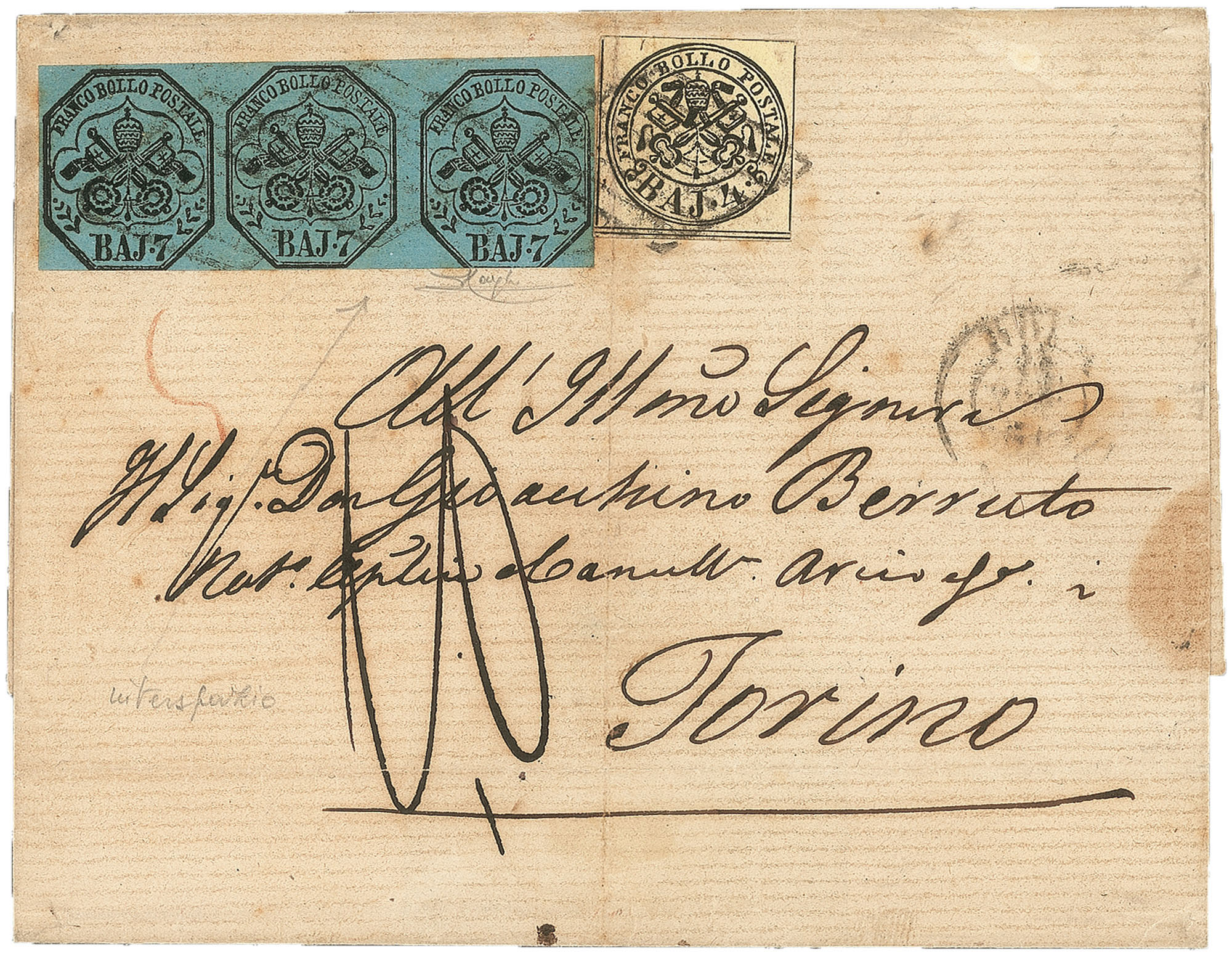 Antichi Stati Italiani - Stato pontificio - Lettera (5Ab + 8 cat.4000+)Lettera cinque porti da Roma a Torino affrancata con 4 baj giallo chiaro + striscia di tre 7 baj azzurro con interspazio di gruppo (5Ab + 8 cat.4000+) con tassa 10 decime - leggera piega verticale che interessa il valore da 4 baj - firma Raybaudi