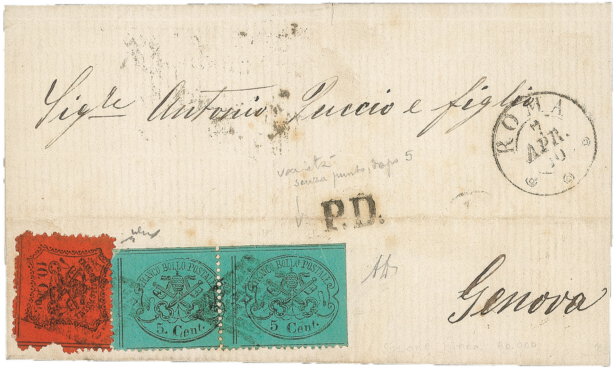 Antichi Stati Italiani - Stato pontificio - Lettera (25 + 25h + 26 cat.700)Lettera affrancata con coppia del 5 cent azzurro chiaro con un esemplare senza punto dopo la cifra + 10 cent arancio vermiglio (25 + 25h + 26 cat.700) da Roma 7 APR. 70 per Genova con bollo P.D. - firma AD e Chiavarello
