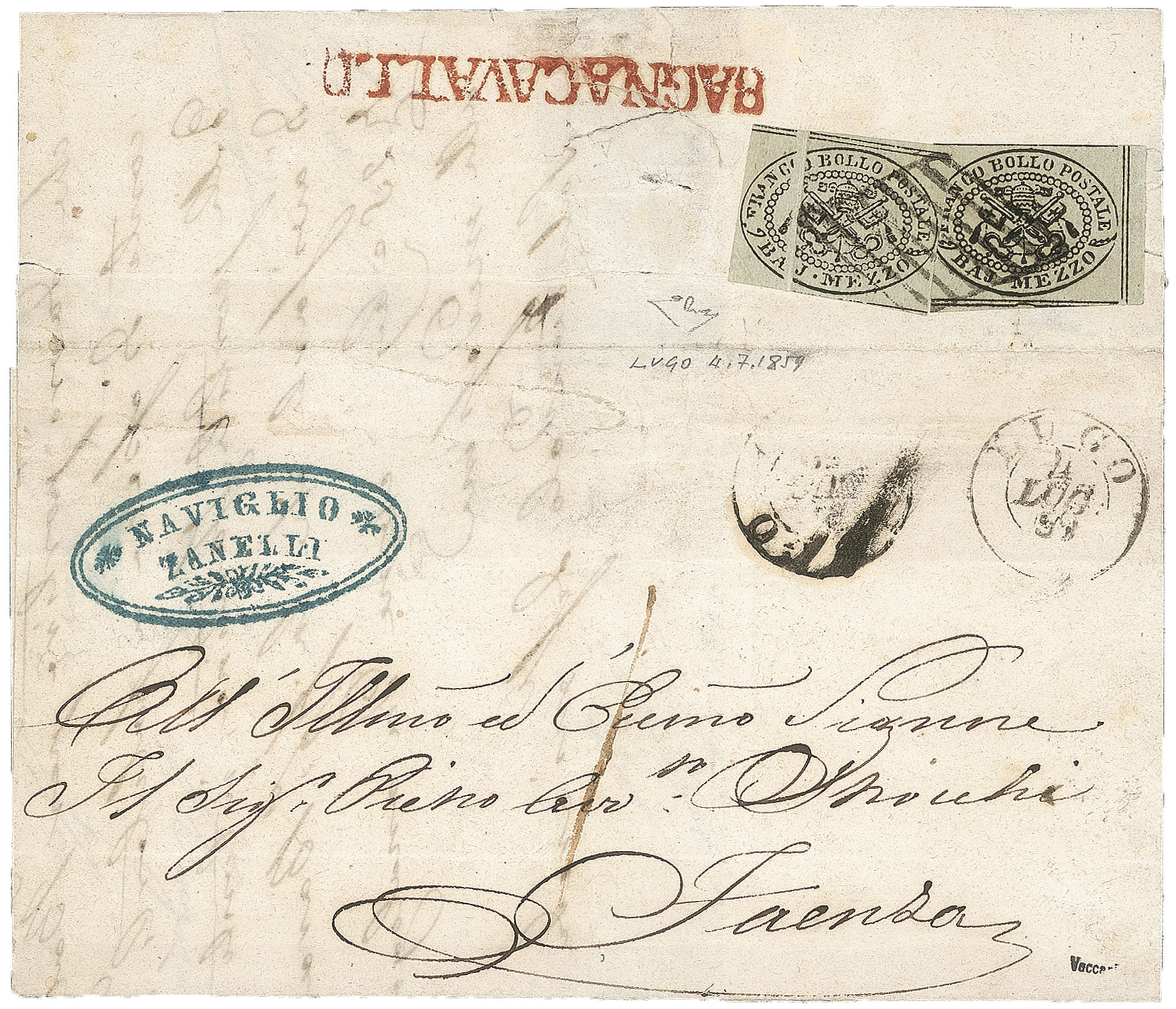 Lettera da Lugo 4 LUG.59 per Faenza affrancata con Pontificio due esemplari del 1/2 baj grigio di cui uno presenta un evidente 'pli d'accordeon' - a tergo il bollo stampatello dritto in rosso Bagnacavallo - insieme di pregio - cert. Enzo Diena