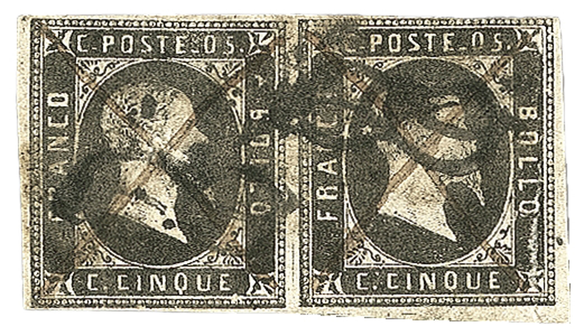 Antichi Stati Italiani - Sardegna - 1851 - Coppia orizzontale del 5 cent (1d)Coppia orizzontale del 5 cent nero grigiastro (1d) - annullata con due tratti di penna a croce + due nodi di Savoia - insieme di pregio