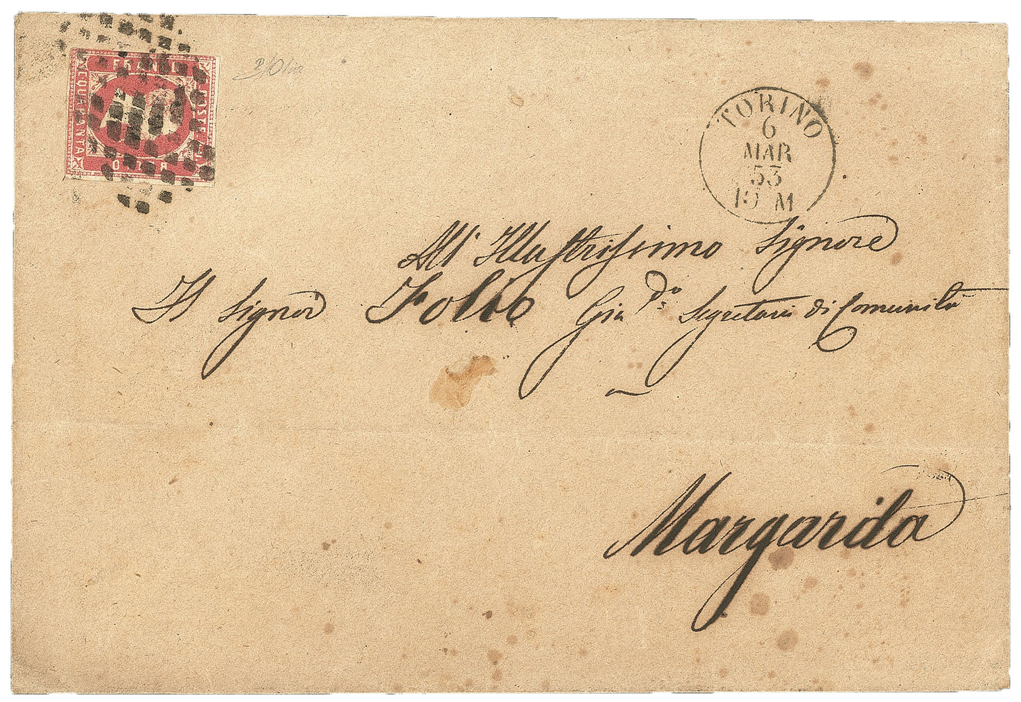 Antichi Stati Italiani - Sardegna - Lettera (3 cat.45000)Lettera affrancata con 40 cent rosa carminio prima emissione (3 cat.45000) con margine a filo sul lato sinistro da Torino 6 MAR 53 per Margarita - Cert. Oliva