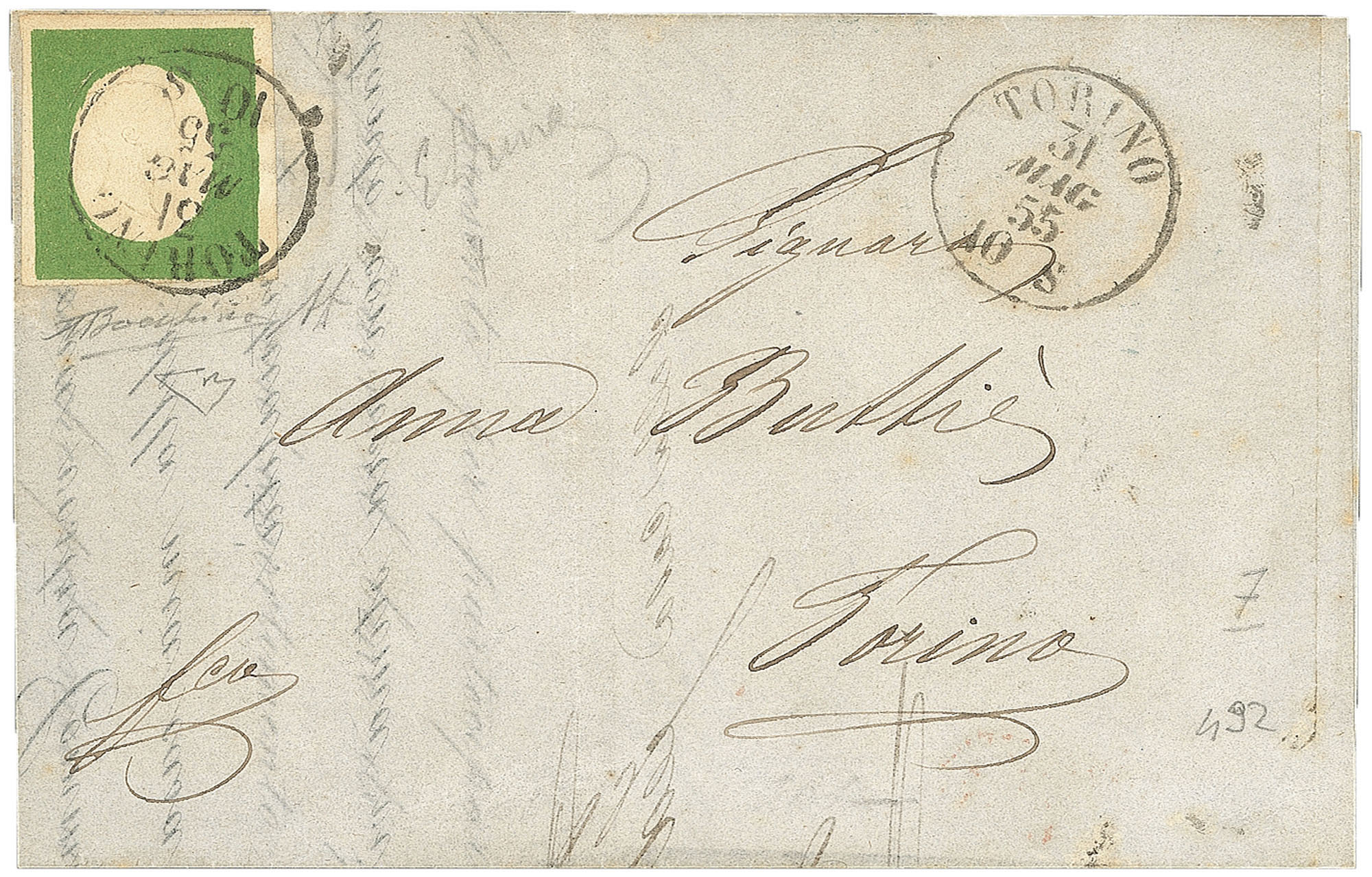 Antichi Stati Italiani - Sardegna - Lettera (7 cat.11875)Lettera da Torino 31 MAG 55 per città affrancata con 5 cent verde giallo (7 cat.11875) isolato - splendido - cert. Enzo Diena