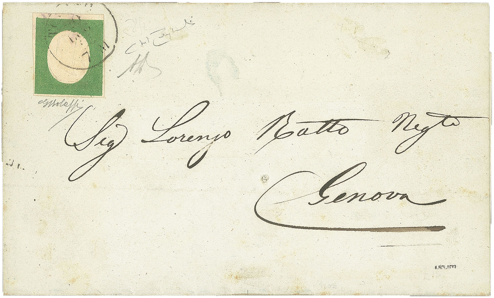 Antichi Stati Italiani - Sardegna - Lettera (7 cat.11875)Lettera circolare da Torino 19 LUG 55 per città affrancata con 5 cent verde giallo (7 cat.11875) isolato - splendido - cert. Raybaudi