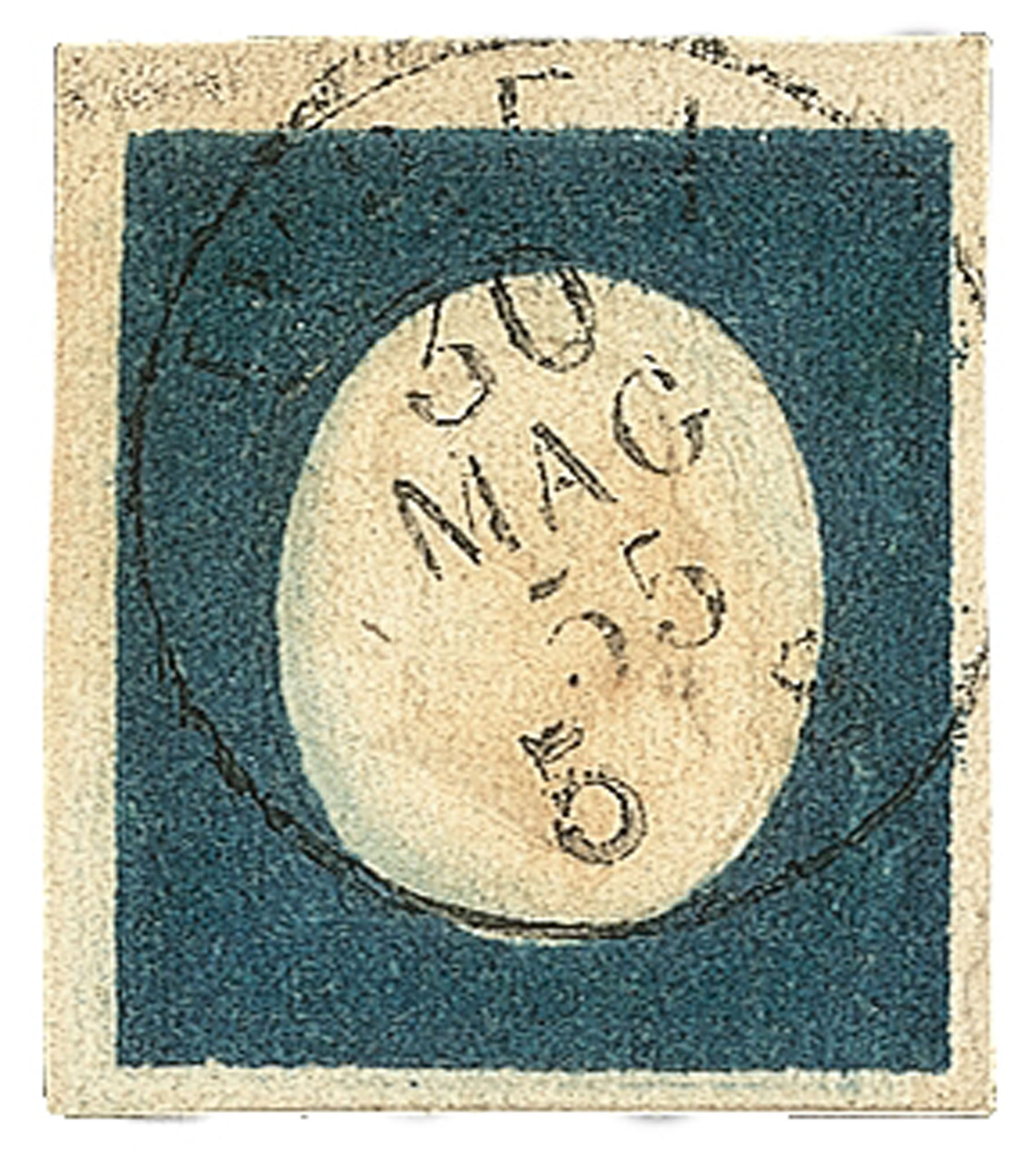 Antichi Stati Italiani - Sardegna - 1854 - 20 cent (8f cat.11000)20 cent azzurro con tripla impronta a secco (8f cat.11000) su frammento con annullo Ivrea 30 MAG.55 - firma EMD + AD + ED + cert Raybaudi + cert. Enzo Diena - rarità