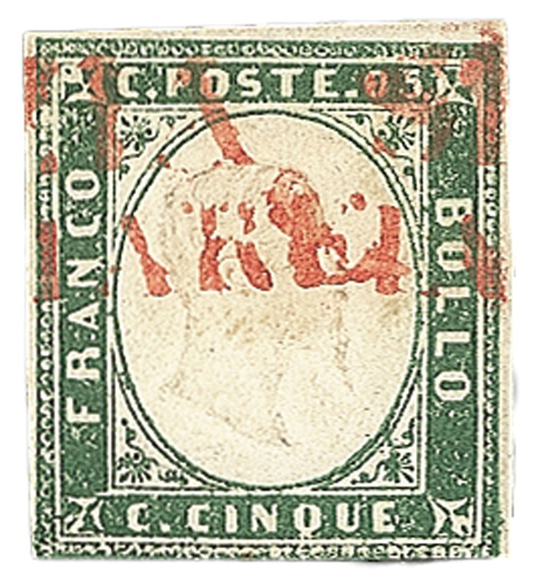 Antichi Stati Italiani - Sardegna - 1855 - 5 cent (13g)5 cent verde smeraldo grigiastro (13g) con annullo rosso su due righe 'Via di mare' - leggermente a filo in basso - molto interessante e bel colore