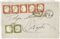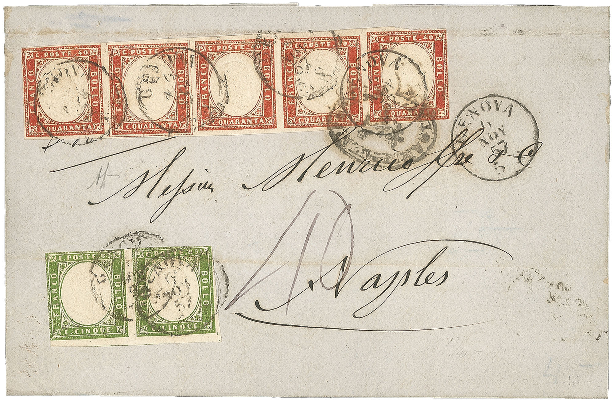 Antichi Stati Italiani - Sardegna - Lettera (13Ad + 16Ab cat.16000+)Lettera tre porti affrancata con striscia orizzontale di cinque 40 cent Vermiglio arancio chiaro posizioni 11-15 compresa la posizione 12 con i quattro filetti di inquadratura + coppia orizzontale del 5 cent verde giallo (13Ad + 16Ab cat.16000+) viaggiata via di mare da Genova 6 NOV.57 per Napoli con segno di tassa - firma AD