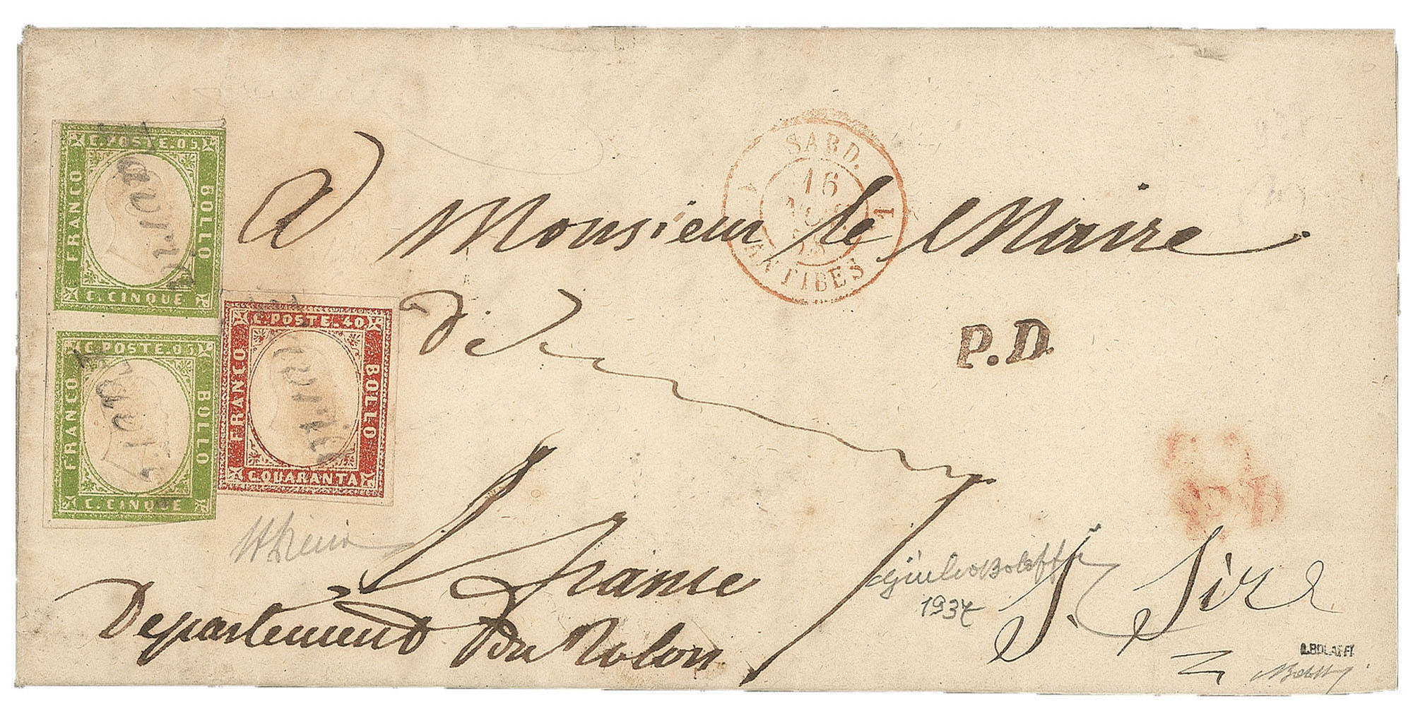Antichi Stati Italiani - Sardegna - Lettera (13Af + 16A)Lettera affrancata con coppia verticale del 5 cent verde giallo chiaro + un 40 cent rosso scarlatto (13Af + 16A) annullati con corsivo 'Favria' per la Francia - rarissimo caso di corsivo su affrancatura