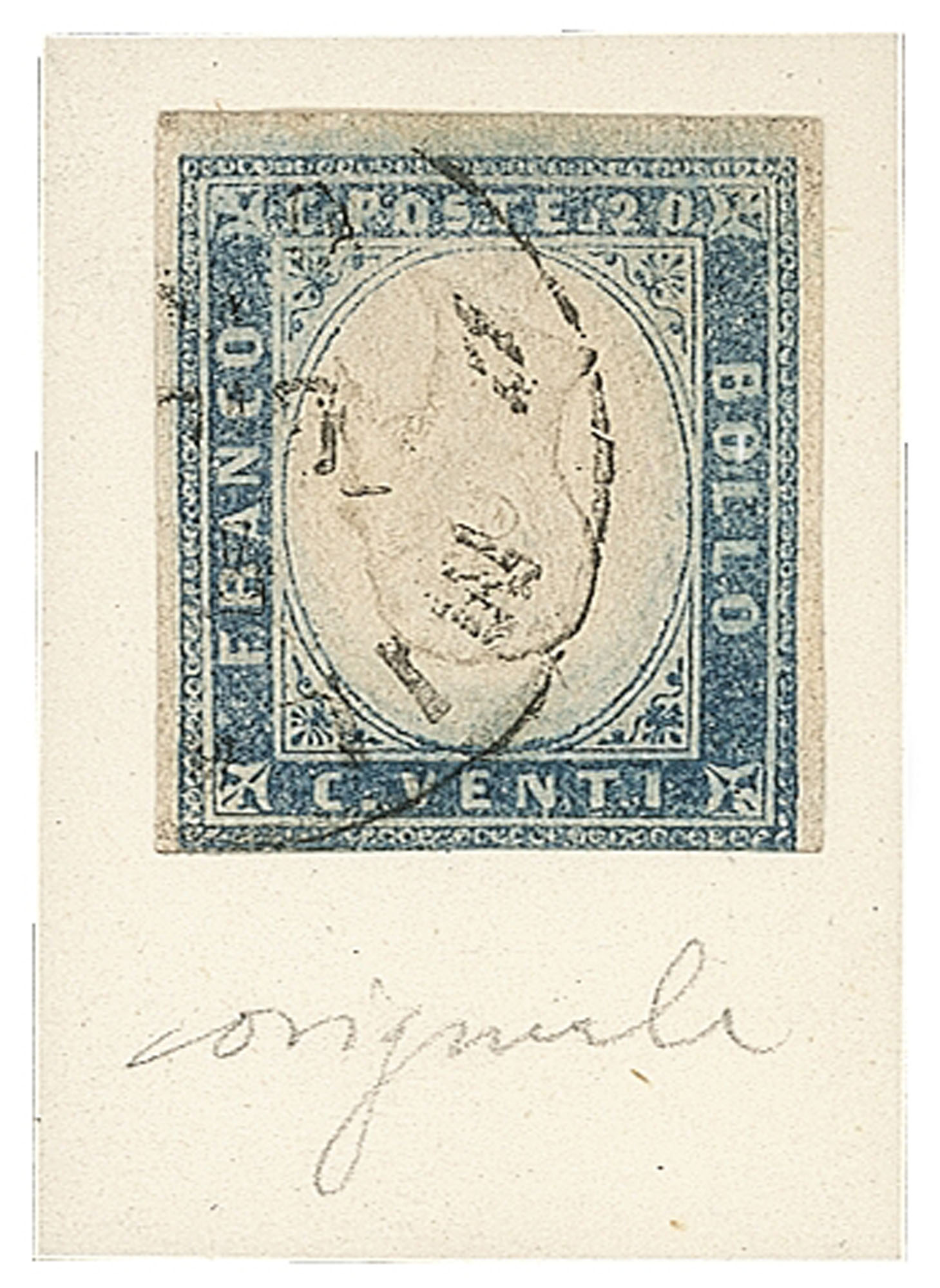 Antichi Stati Italiani - Sardegna - 1861 - 20 cent (15Db)20 cent celeste grigiastro (15Db) - con effigie capovolta - usato a Milano - applicato su cartoncino - firma AD