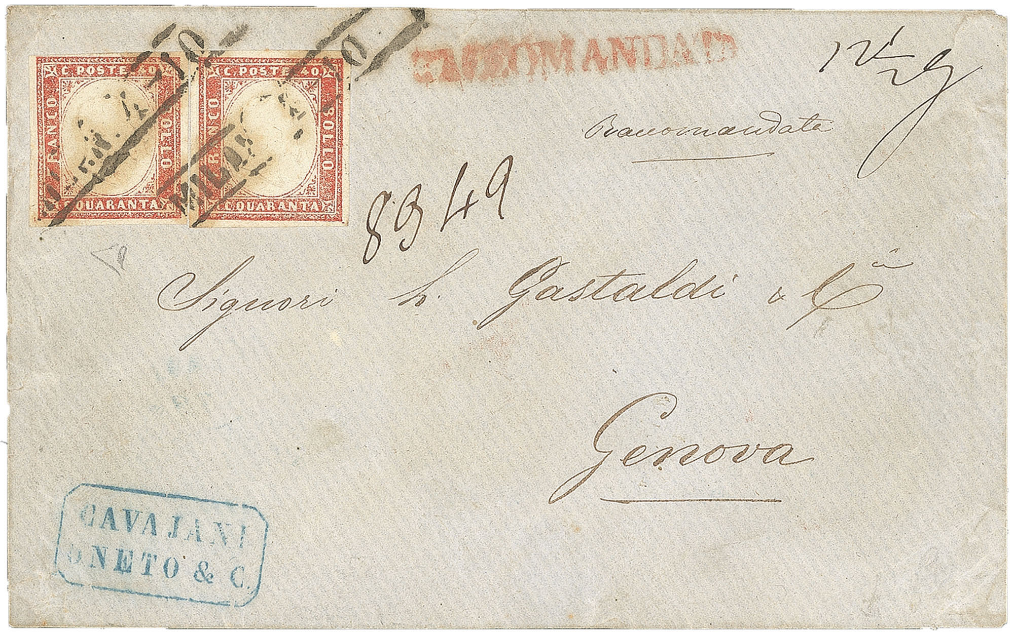 Bustina raccomandata affrancata con due esemplari del 40 cent rosso carminato (16Bb P.ti 9 cat.4050) annullati con bollo riquadrato Milano 4.10 del 1859 per Genova - asportata gran parte del retro per togliere le ceralacche - cert. Enzo Diena