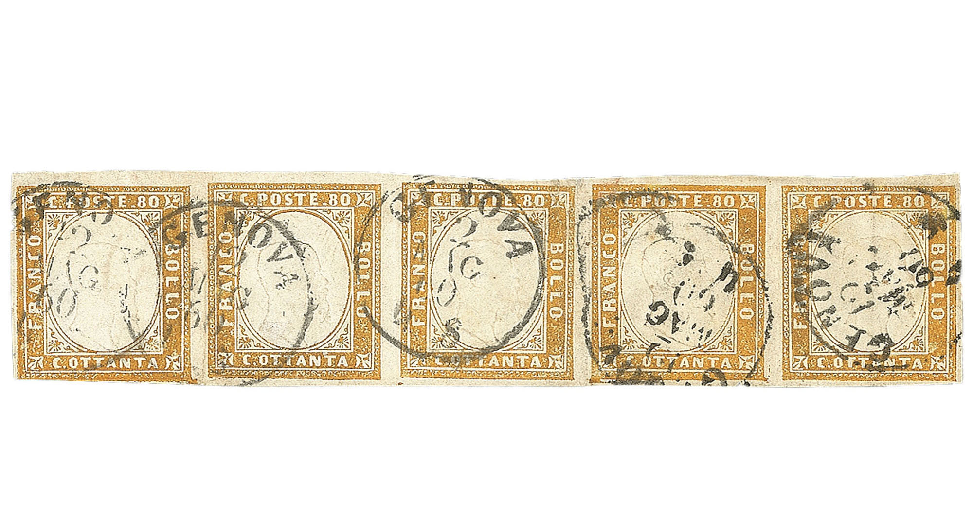 Antichi Stati Italiani - Sardegna - 1858 - Striscia orizzontale di cinque del 80 cent (17B cat.18000)Striscia orizzontale di cinque del 80 cent giallo arancio chiaro (17B cat.18000) - usata con annullo Genova 12 MAG 60 - cert. Sorani