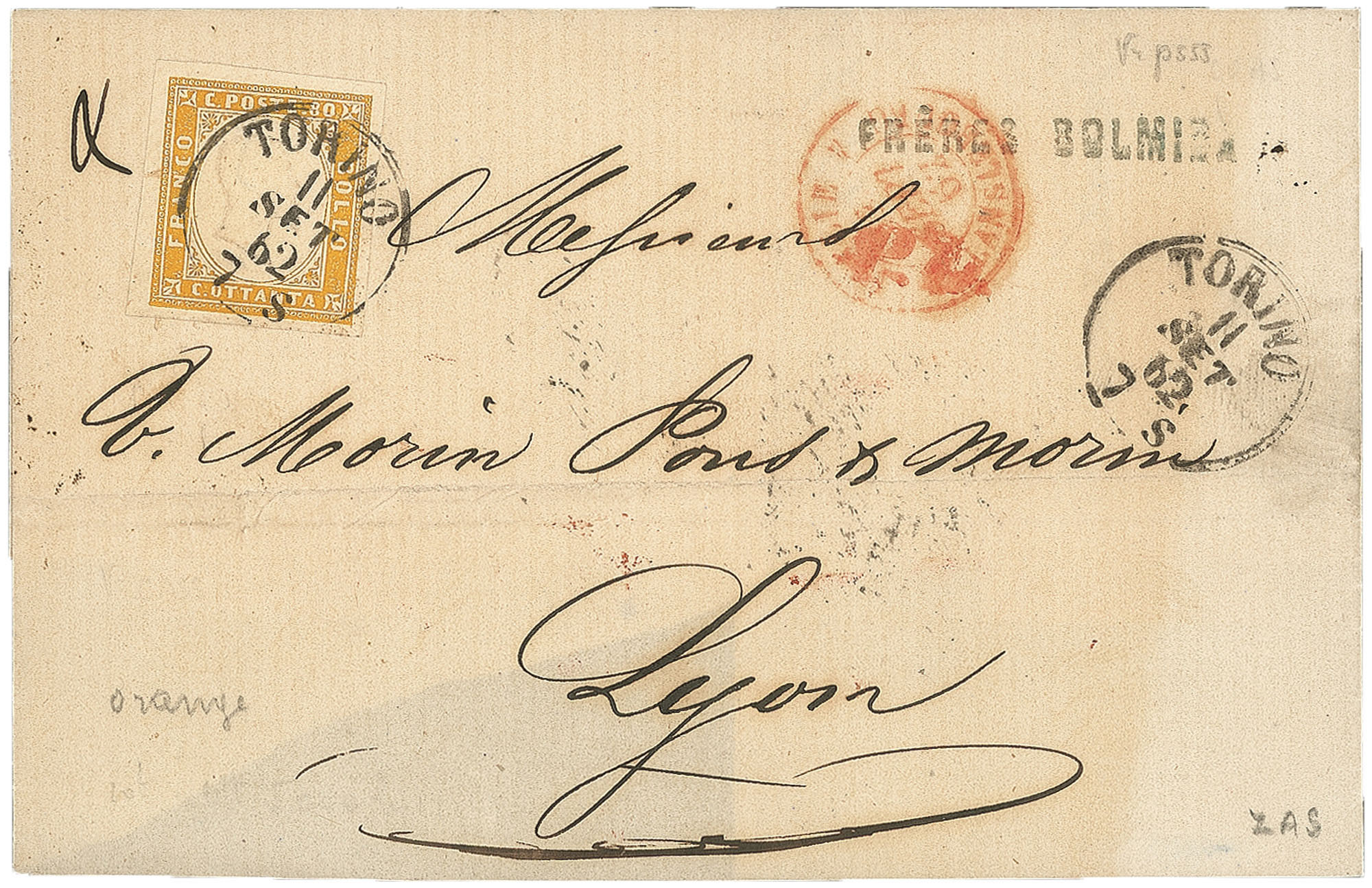 Antichi Stati Italiani - Sardegna - Lettera (17C)Lettera doppio porto affrancata con 80 cent giallo arancio (17C) da Torino 11 SETT 62 per Lione - qualità SPL
