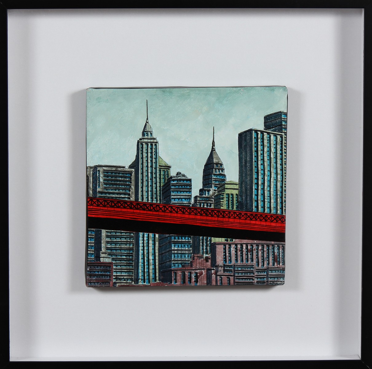 CAPUTO ANTONIO (n. 1933) Down Town crassing. Olio su tela . Cm 25,00 x 25,00. Firmato in basso a sinistra. Al retro titolo e firma. Autentica dell'artista su fotografia come da documentazione allegata all'opera. Cornice presente