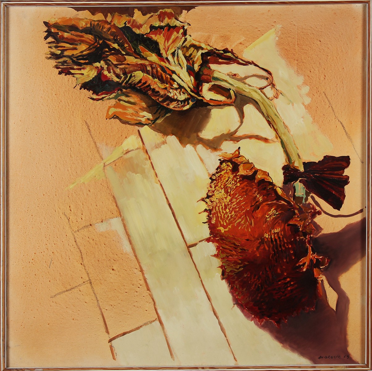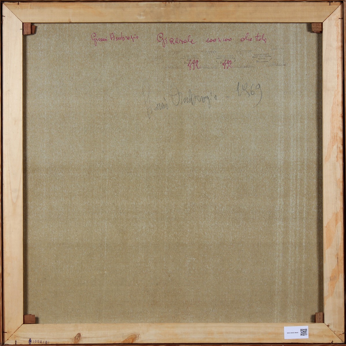 AMBORGIO GIANNI (n. 1928) Girasole. 1962. Olio su tela . Cm 100,00 x 100,00. Firma e data in basso a destra. Al retro firma, titolo, data e timbro galleria San Michele. Numero di inventario 492. Cornice presente