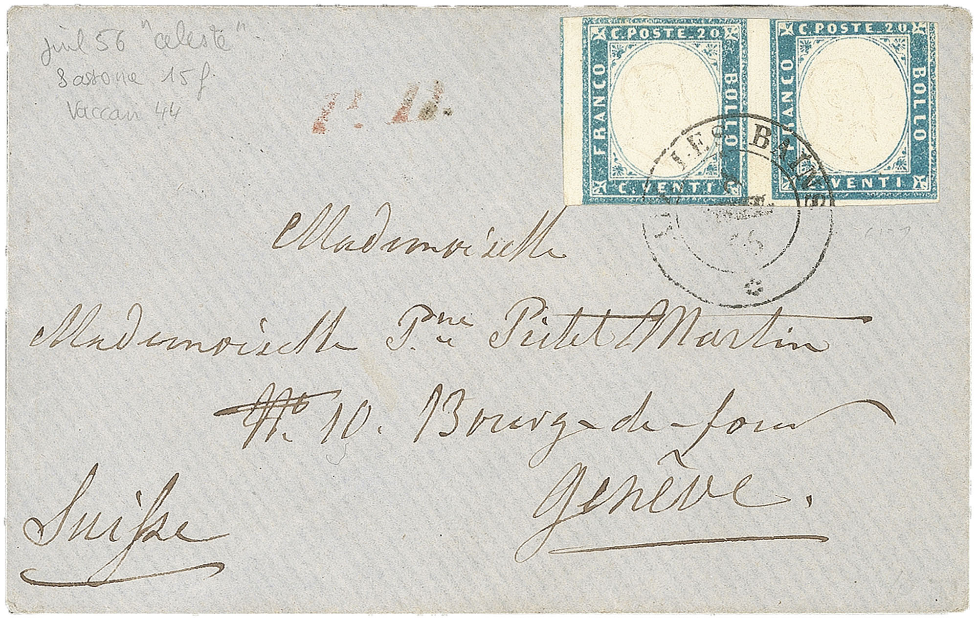 Antichi Stati Italiani - Sardegna - Annulli Savoia - 20 cent (15f)Bustina affrancata con coppia orizzontale del 20 cent (15f) - difetti - da Aix Les Bains JUIL.56 + P.D. per la Svizzera - fresca