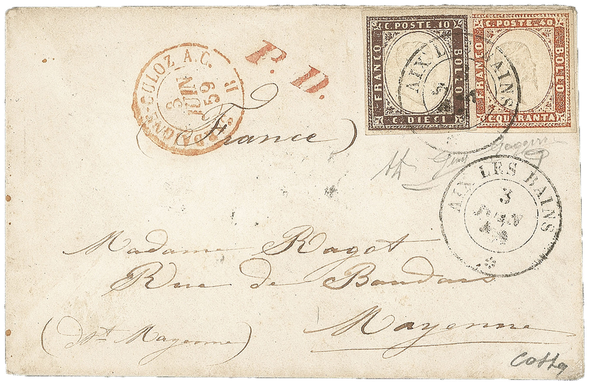 Bustina per la Francia affrancata con 10 cent bruno porpora + 40 cent vermiglio arancio chiaro (14Ac + 16Ab) da Aix Les Bains 3 JUIN 59 per Mayenne con i bolli in rosso P.D. e doppio cerchio Sardaigne-Culoz A.C. 3 JUIN 59 B. - cert Colla