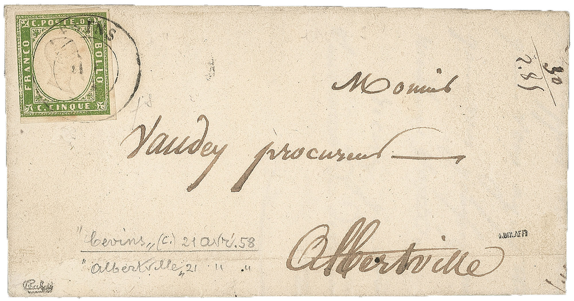 Antichi Stati Italiani - Sardegna - Annulli Savoia - 5 cent (13Ag)Lettera affrancata con 5 cent verde giallo (13Ag) da Cevins 21AVR.58 per Albertville - raro annullo su letterina in distretto