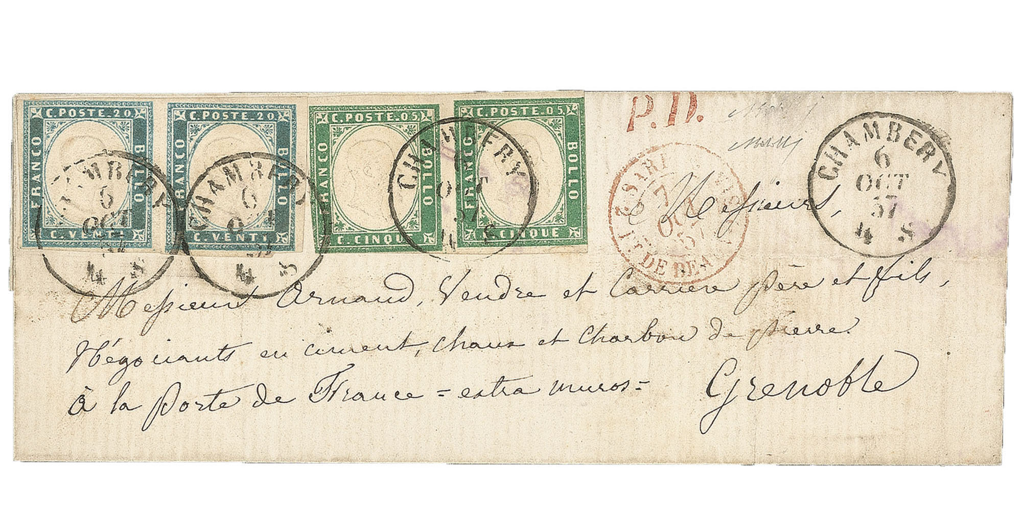 Antichi Stati Italiani - Sardegna - Annulli Savoia - 5 cent + coppia 20 centLettera affrancata con coppia del 5 cent verde smeraldo + coppia del 20 cent cobalto da Chambert 6 OCT.57 a Grenoble - insieme con leggeri difetti ma di grande effetto