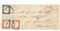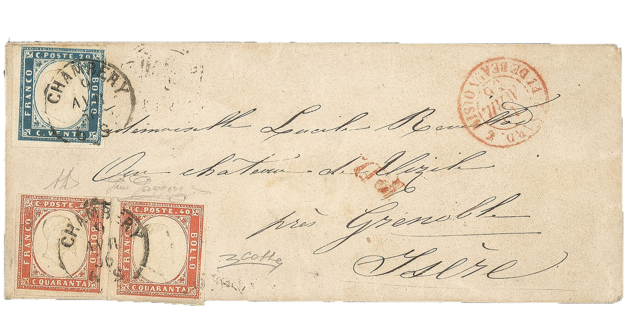 Antichi Stati Italiani - Sardegna - Annulli Savoia - 20 cent + due 40 cent (15f + 16)Lettera doppio porto per la Francia affrancata con 20 cent celeste + due esemplari del 40 cent vermiglio tenue (15f + 16) - tutti ben marginati - da Chambery 9 AVR.56 per Grenoble con P.D. in rosso e bollo d'ingresso Sard. 2 Pt De Beauvoisin 10 AVRIL 56 in rosso - cert. Colla