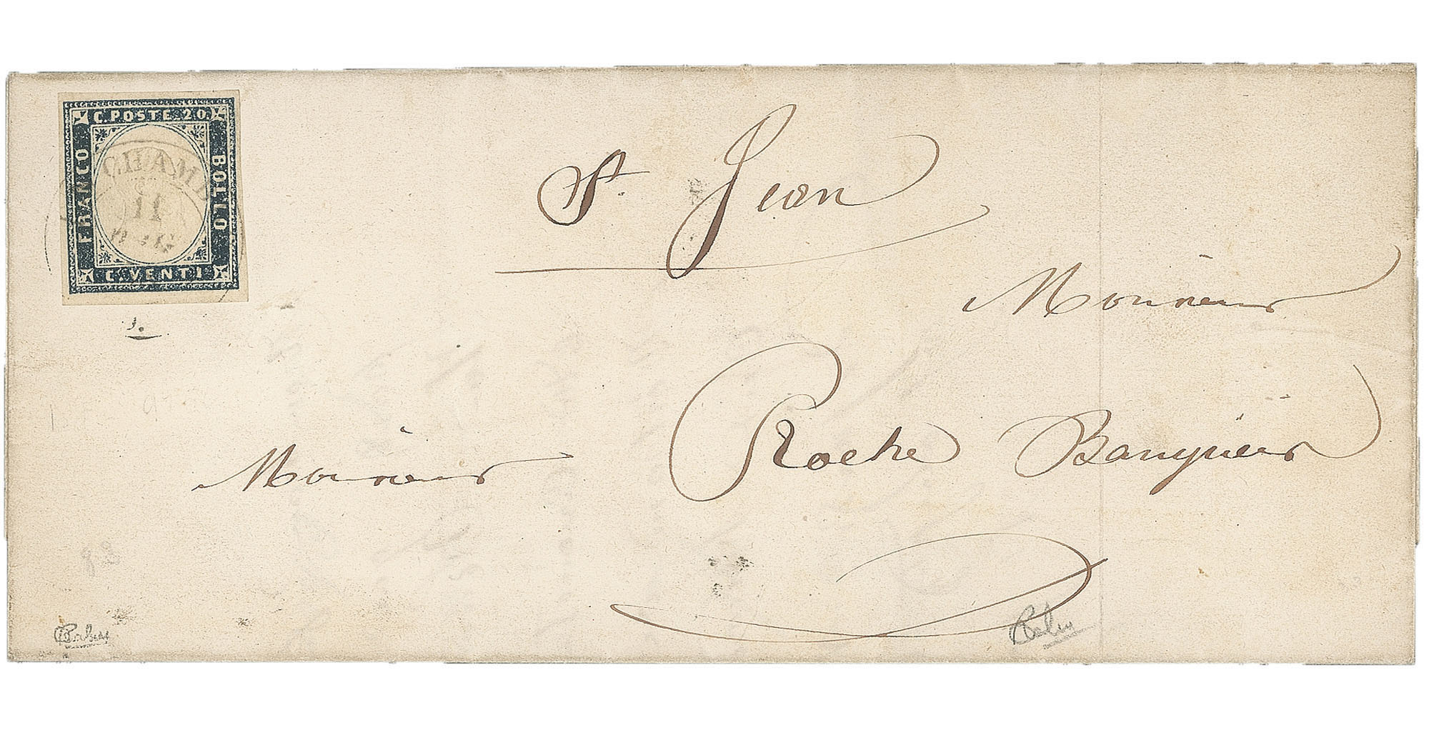 Antichi Stati Italiani - Sardegna - Annulli Savoia - 20 cent (15Ab)Lettera affrancata con 20 cent indaco (15Ab) ben marginato - da La Chambre 11 MAG.58 (P.tI 8) per S. Jean - raro e molto bello