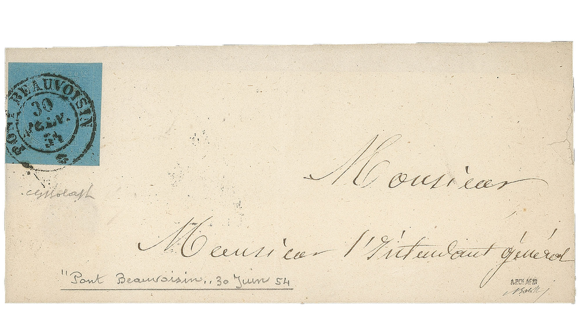 Antichi Stati Italiani - Sardegna - Annulli Savoia - 20 cent (5)Lettera affrancata con 20 cent azzurro (5) da Pont Beauovosin 30 JUIN.54 per Chambery - splendida