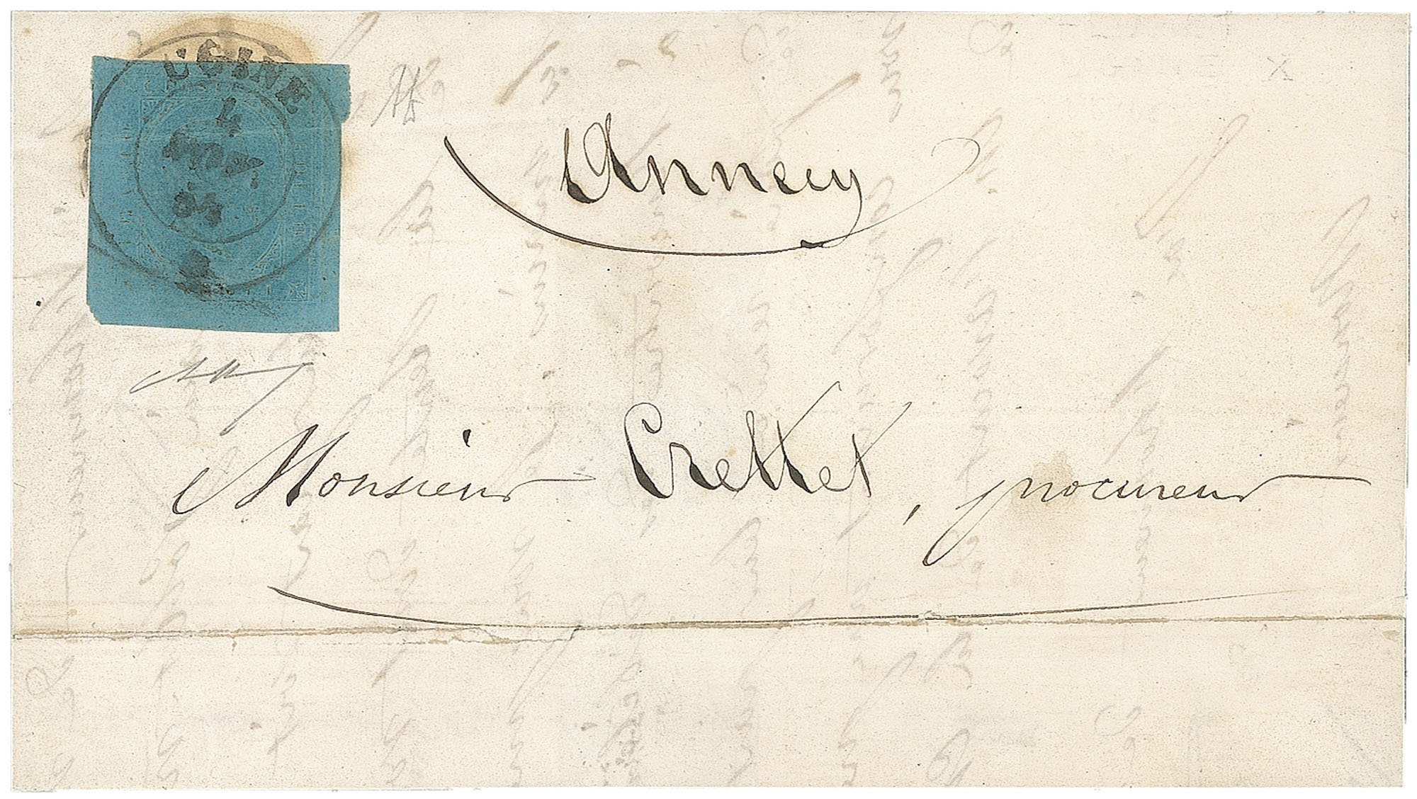 Antichi Stati Italiani - Sardegna - Annulli Savoia - 20 cent (5)Lettera affrancata con 20 cent azzurro (5) ben marginato con leggera piega orizzontale da Ugine 4 NOV.54 (p.ti 11) per Annecy - solamente due lettere note da Ugine su questa emissione